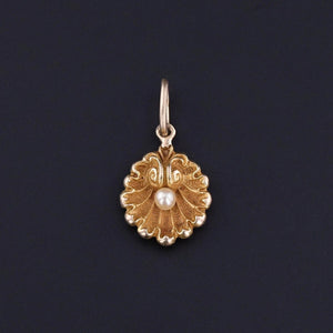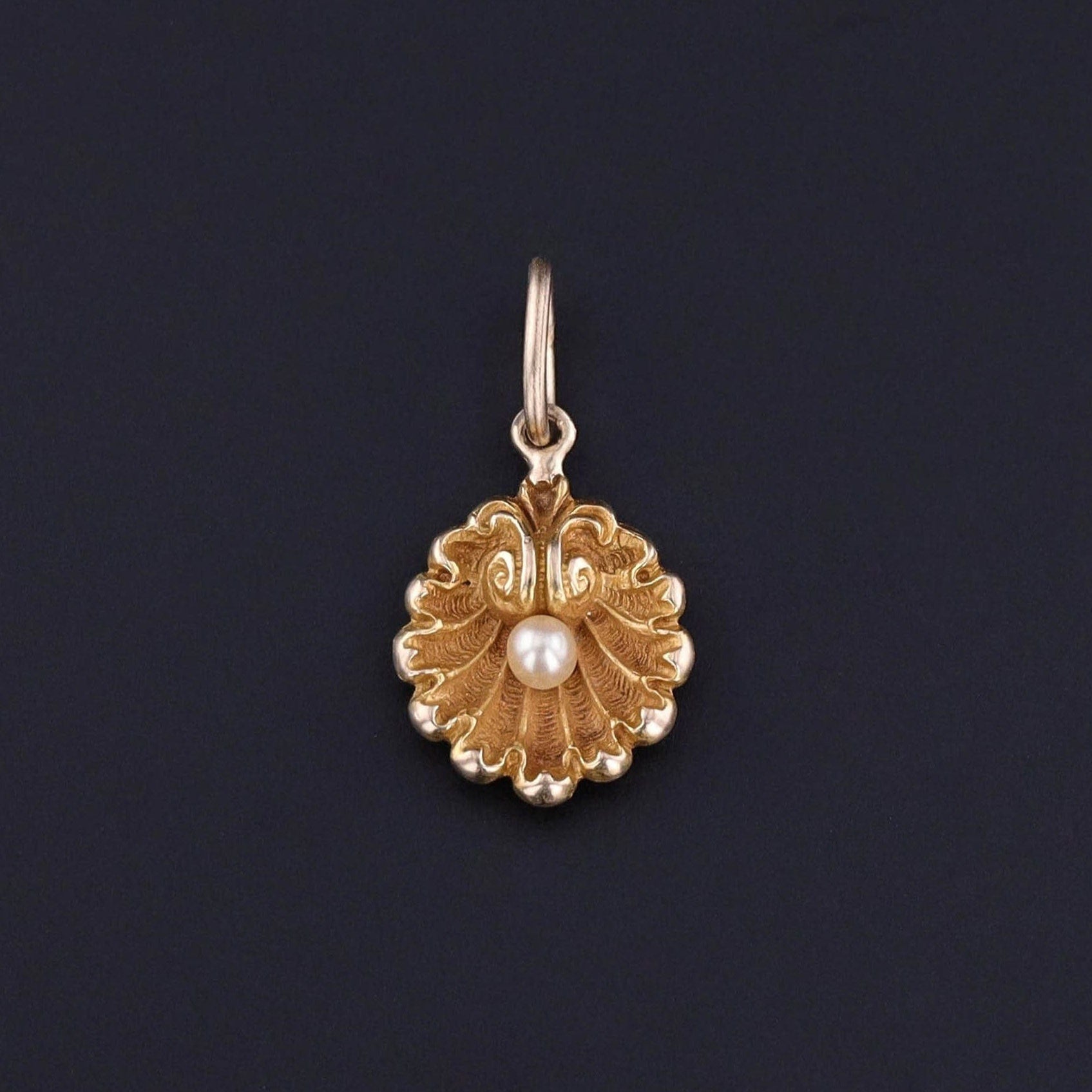 This petite charm features a finely rendered scallop shell of 14k gold with a pearl accent at its center. The shell was originally an antique stickpin (circa 1900) that our jeweler transformed by removing the pin stem and adding a jump ring bail.