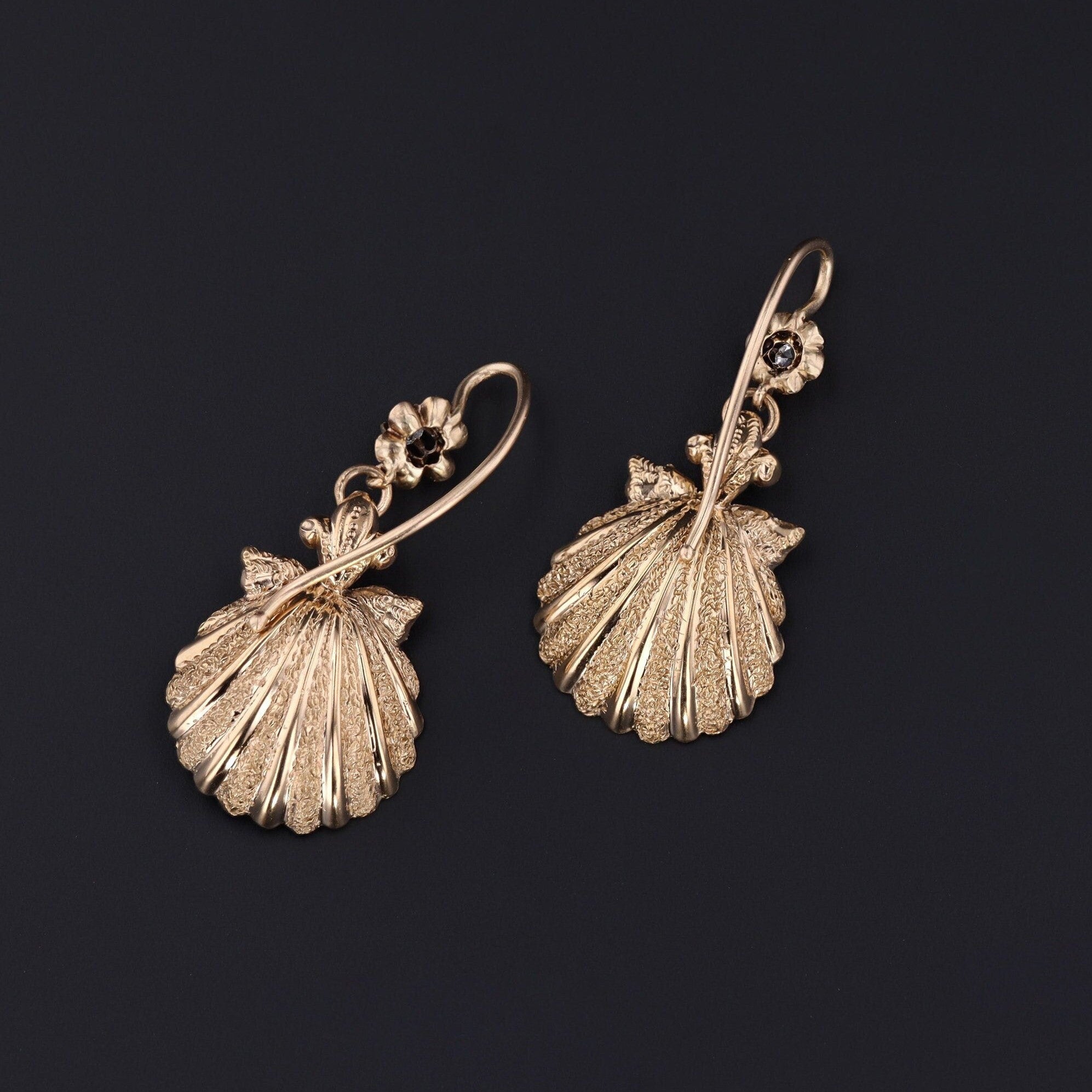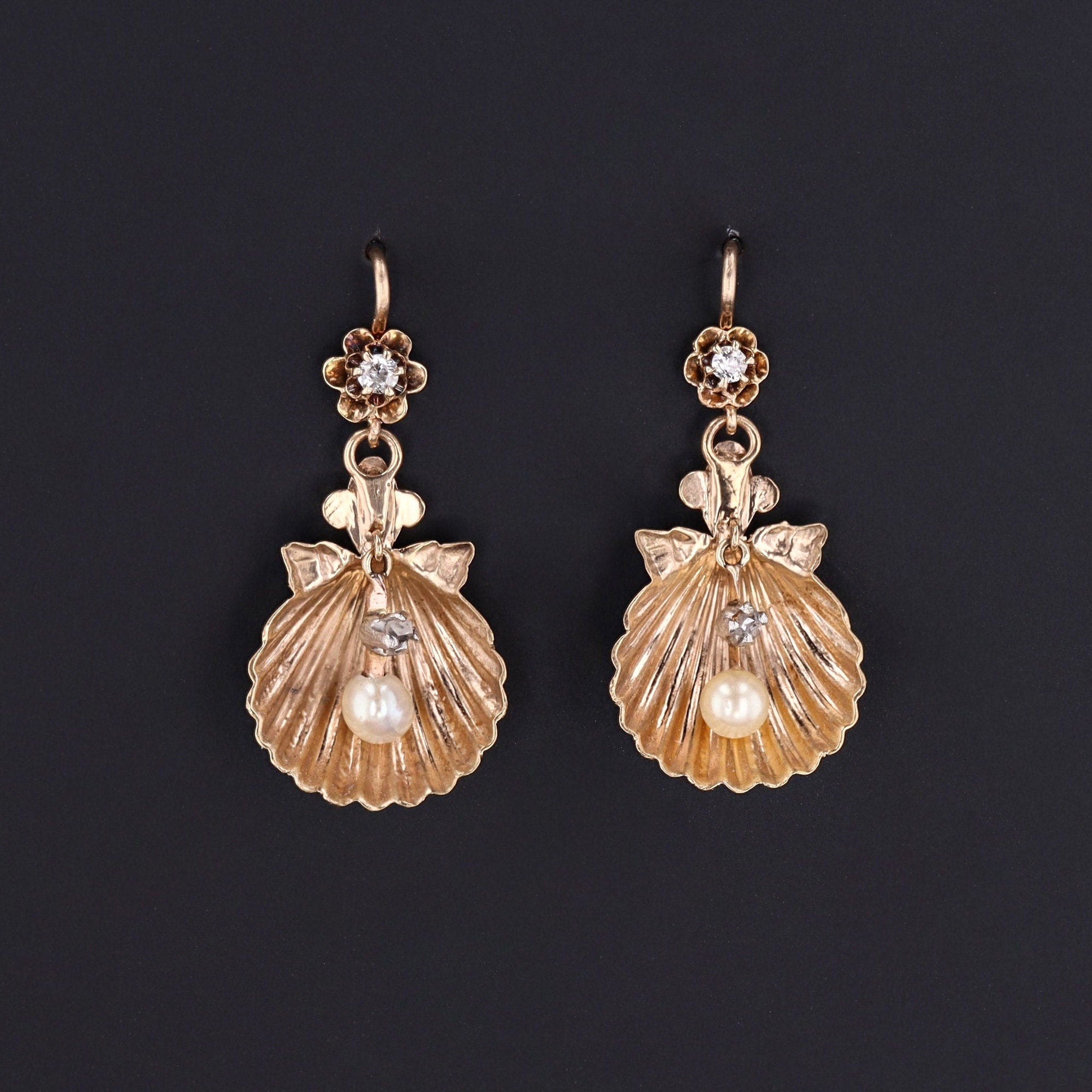 The earrings, circa 1880, are 14K yellow gold with diamond surmounts and scallop shell dangles with pearl and diamond accents.