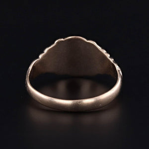 This antique 10k gold signet ring (circa 1920-1930) features floral shoulders and a blank face. The inside of the band bears the makers mark for Wood & Sons of Brooklyn, New York.
