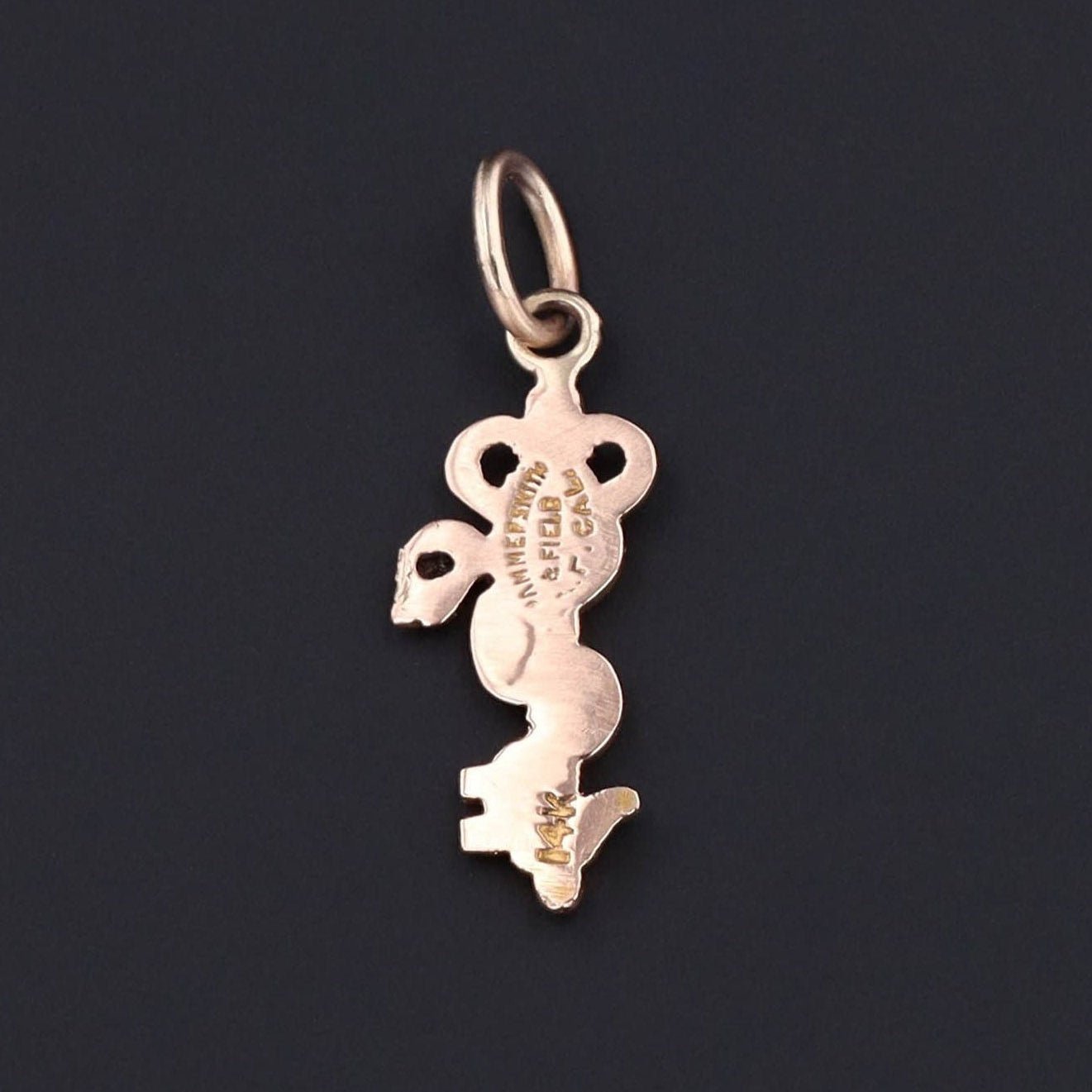 This antique charm (circa 1915-1920) features a 14k gold snake with a single emerald eye entwined around a golden key. The reverse bears the makers mark of Hammersmith & Field of San Francisco.