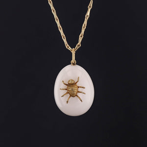 This antique 14k gold pendant (circa 1910-1920) features a golden spider atop an egg shaped white stone pendant.