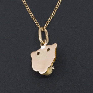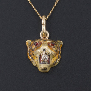 This magnificent tiger pendant (circa 1890-1910) is fearsome and beautiful at the same time. The 10k gold tiger was originally an antique stick pin transformed with the addition of a 10k gold bail. It is finely rendered with iridescent orange, black and cream enamel, two tiny garnet eyes, and a diamond in its teeth.