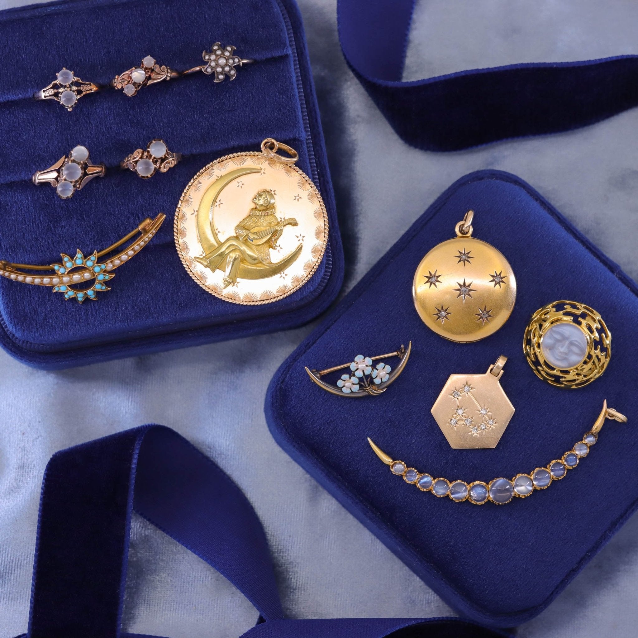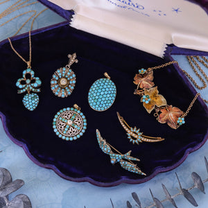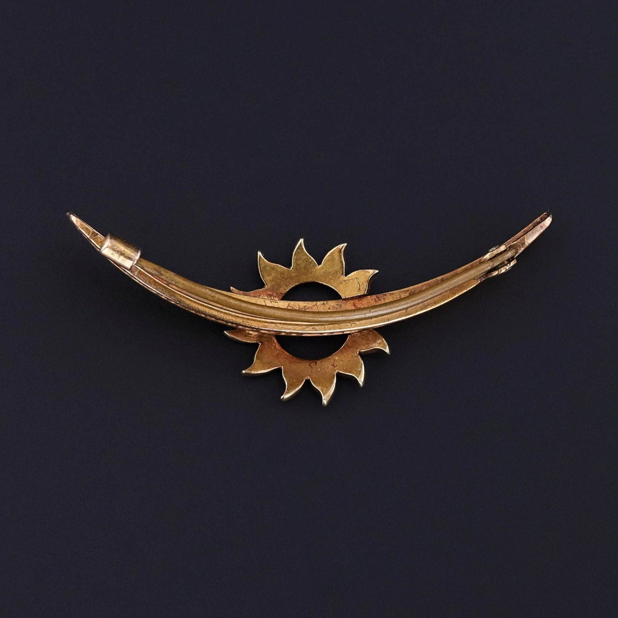 This eye-catching brooch (circa 1890–1910) captures the elegance of the turn of the 20th century with its striking celestial design. A luminous pearl crescent glows at the center of a radiant turquoise sunburst, the composition symbolizing harmony between the moon and sun—a motif beloved in late Victorian and Edwardian jewelry.