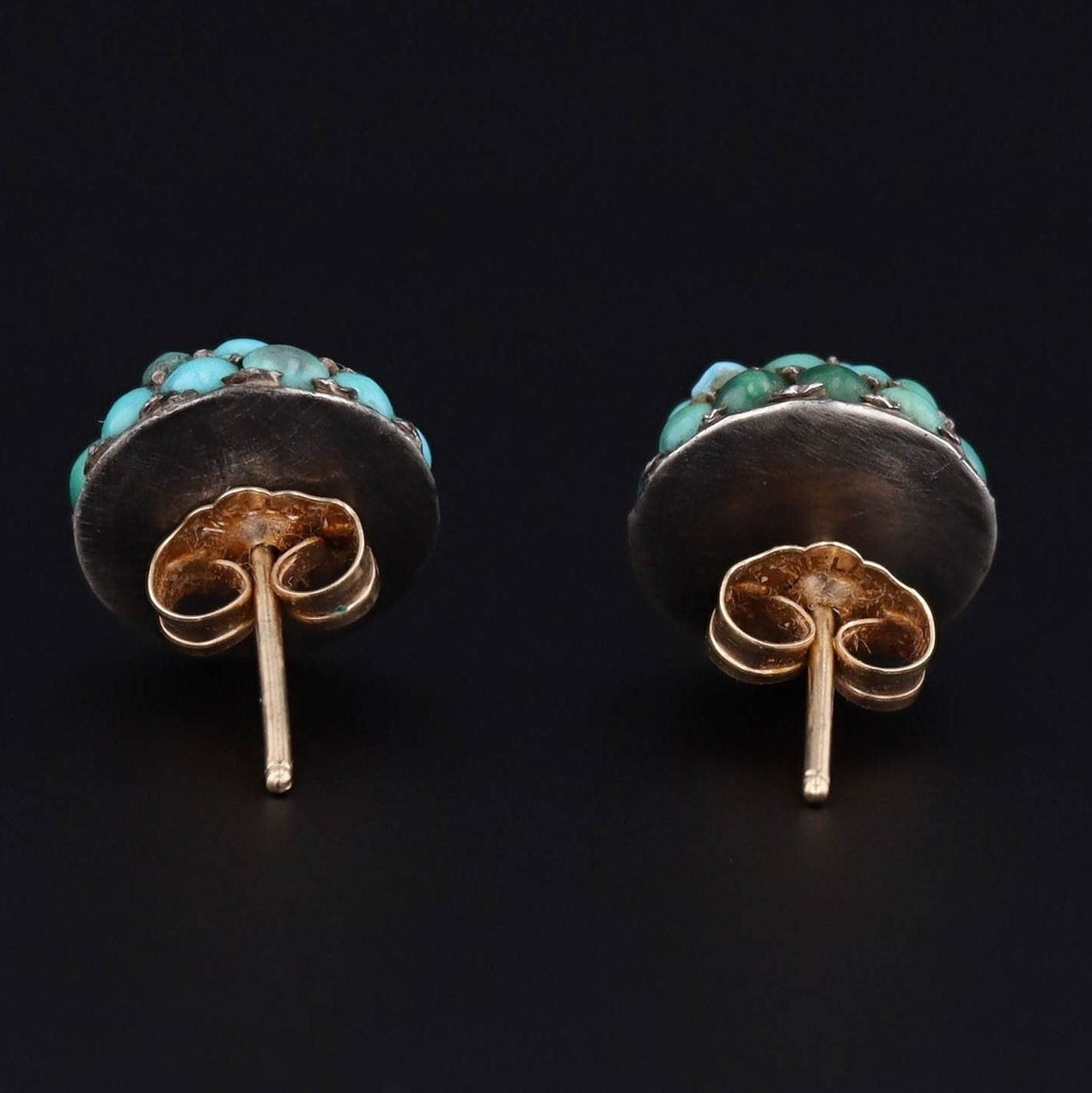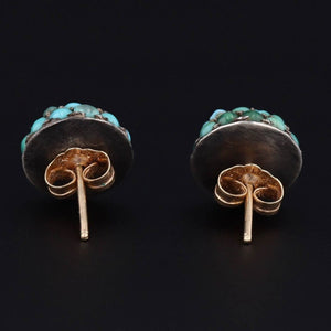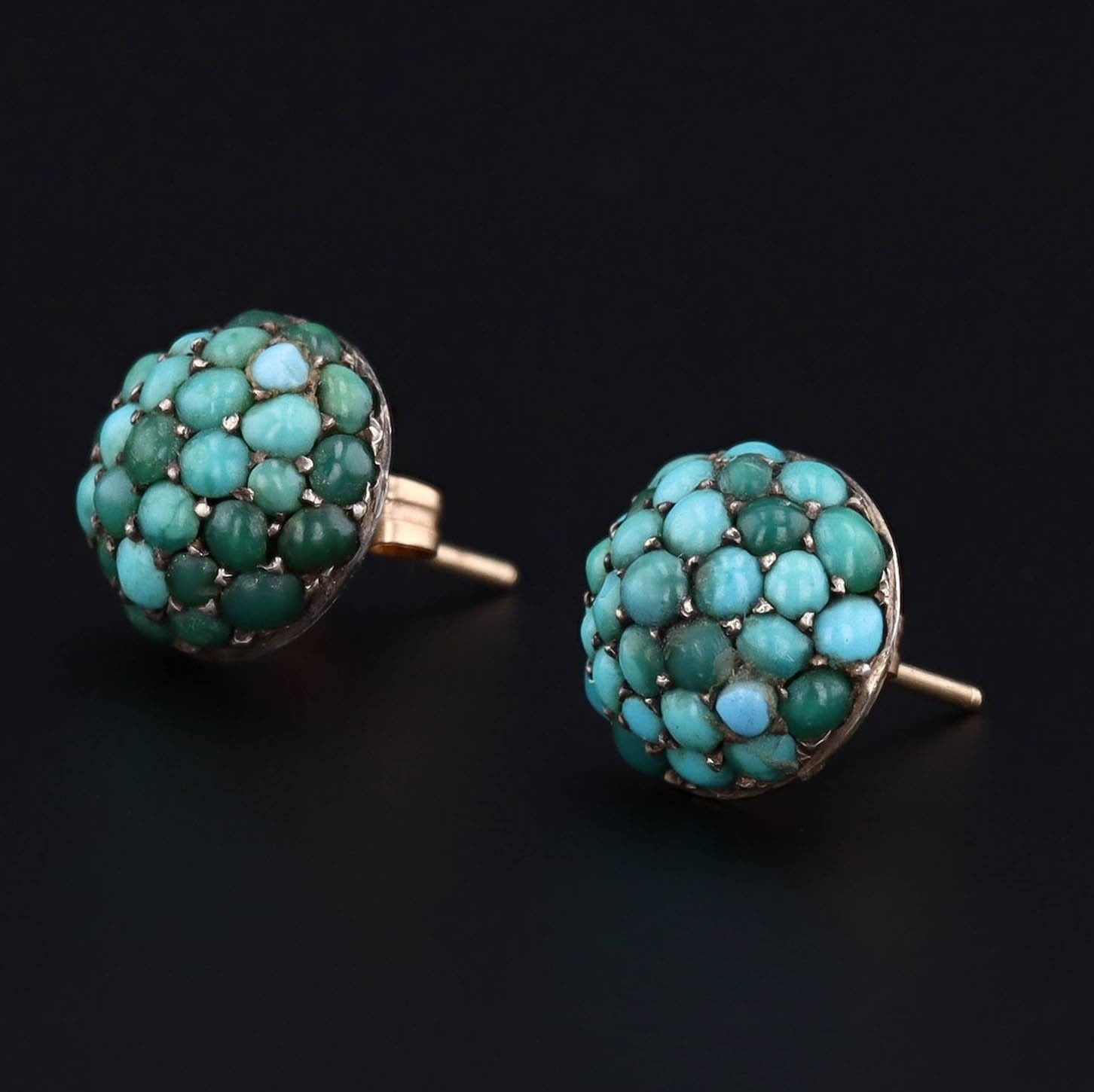 These striking earrings feature a pave of turquoise cabochons set in silver. The turquoise portions of the earrings were originally antique shirt studs (circa 1900-1910) transformed with the addition of 14k gold posts.