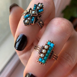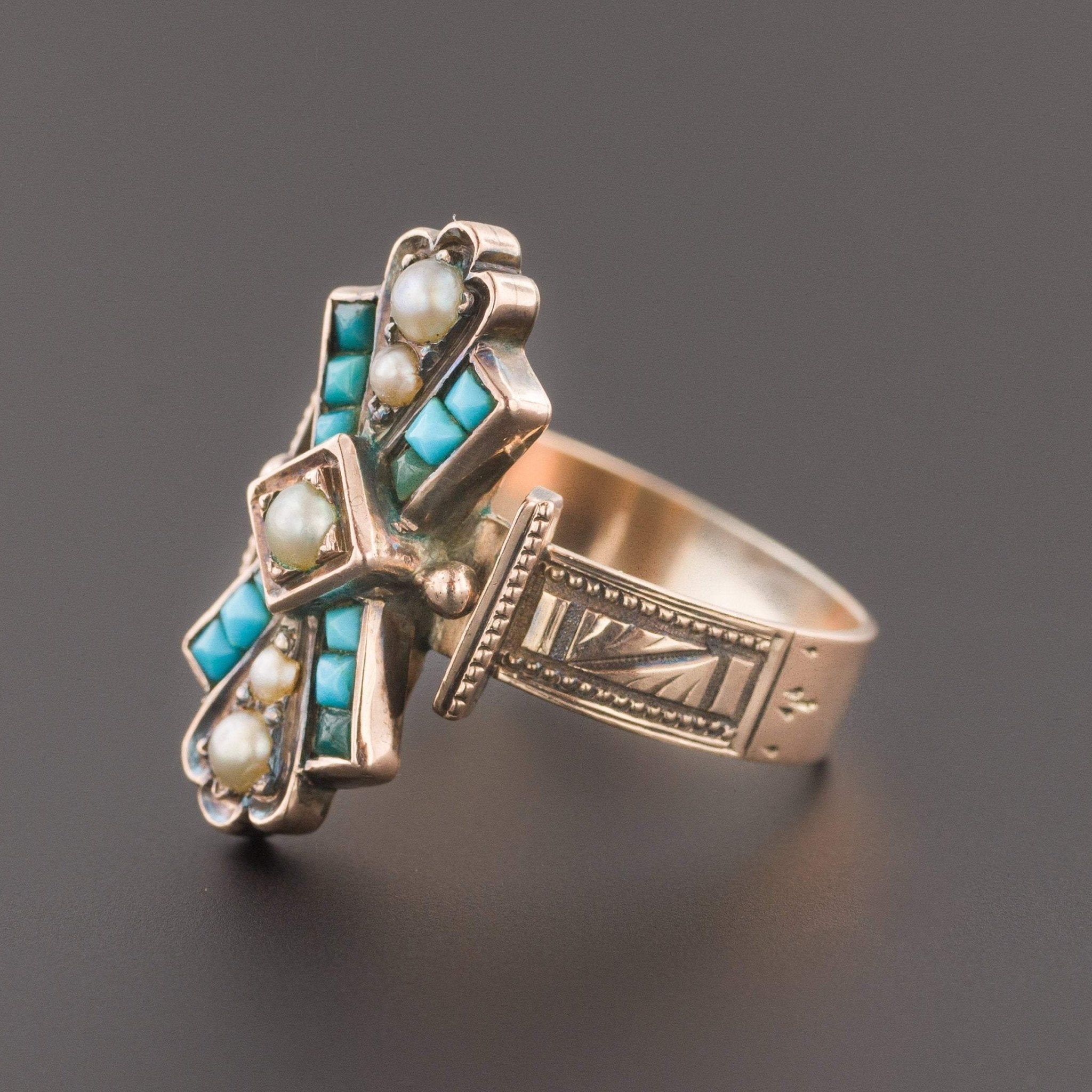 A 19th century ring with beautifully etched shoulders and turquoise and pearl accents.