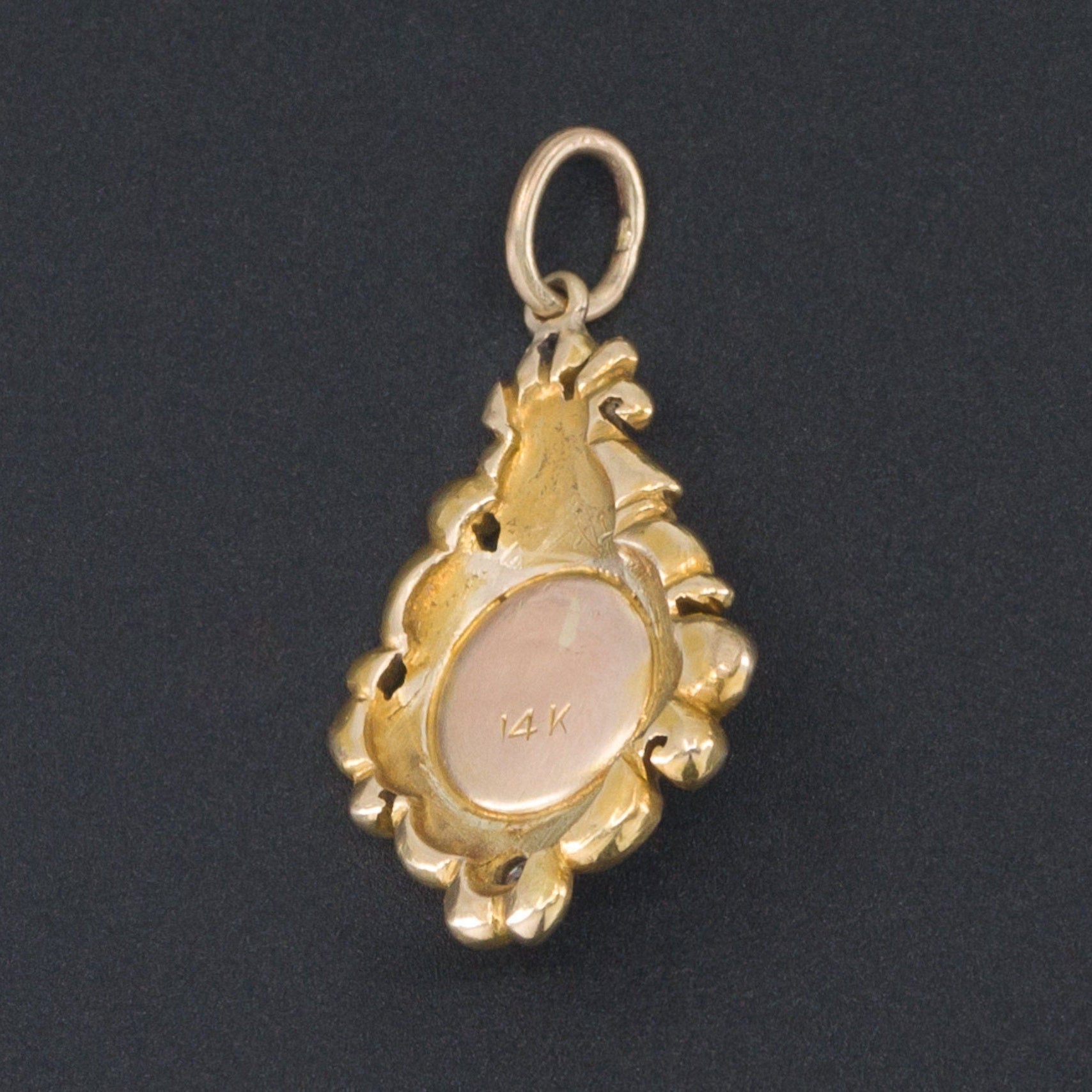 The charm was originally an antique stick pin (circa 1900-1910). It is marked 14k gold and measures 0.9 inches from top to bottom by 0.5 inches wide. It is in excellent condition.