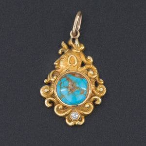 A dramatic charm depicting a gold Native accented with bold blue turquoise and a diamond.