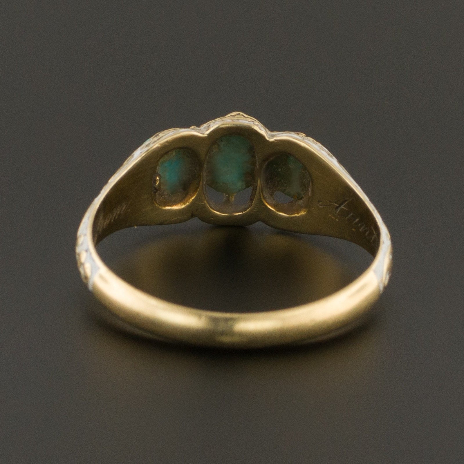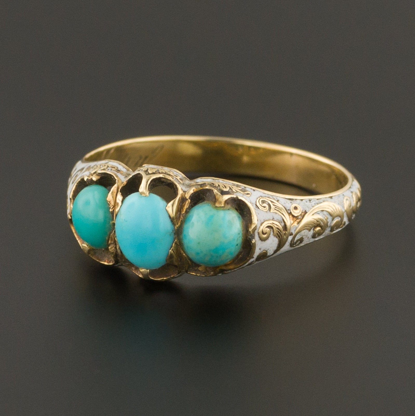 This mid Victorian ring (circa 1850-1870) features three vibrant turquoise cabochons set in an elegant white enamel band. The hand crafted band is unmarked, but acid tests for 14k gold. The interior of the band is engraved "Bessie from Aunt Mary."