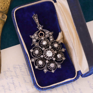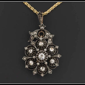 A masterwork of 19th-century craftsmanship, this elegant diamond pendant (circa 1860–1890) captures the romance of the era with exceptional detail. The design centers on an open-back mine cut diamond of approximately 0.40 carats, set in a coronet mount, and encircled by 37 closed-back rose cut diamonds. Together, the stones total approximately 1.4 carats, creating a striking play of light and shadow.