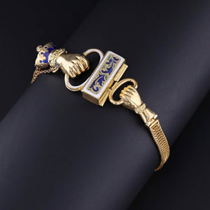 This elegant 14k gold bracelet (circa 1840) features a two hands that hold a white and blue enamel locket.