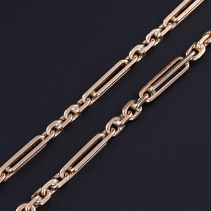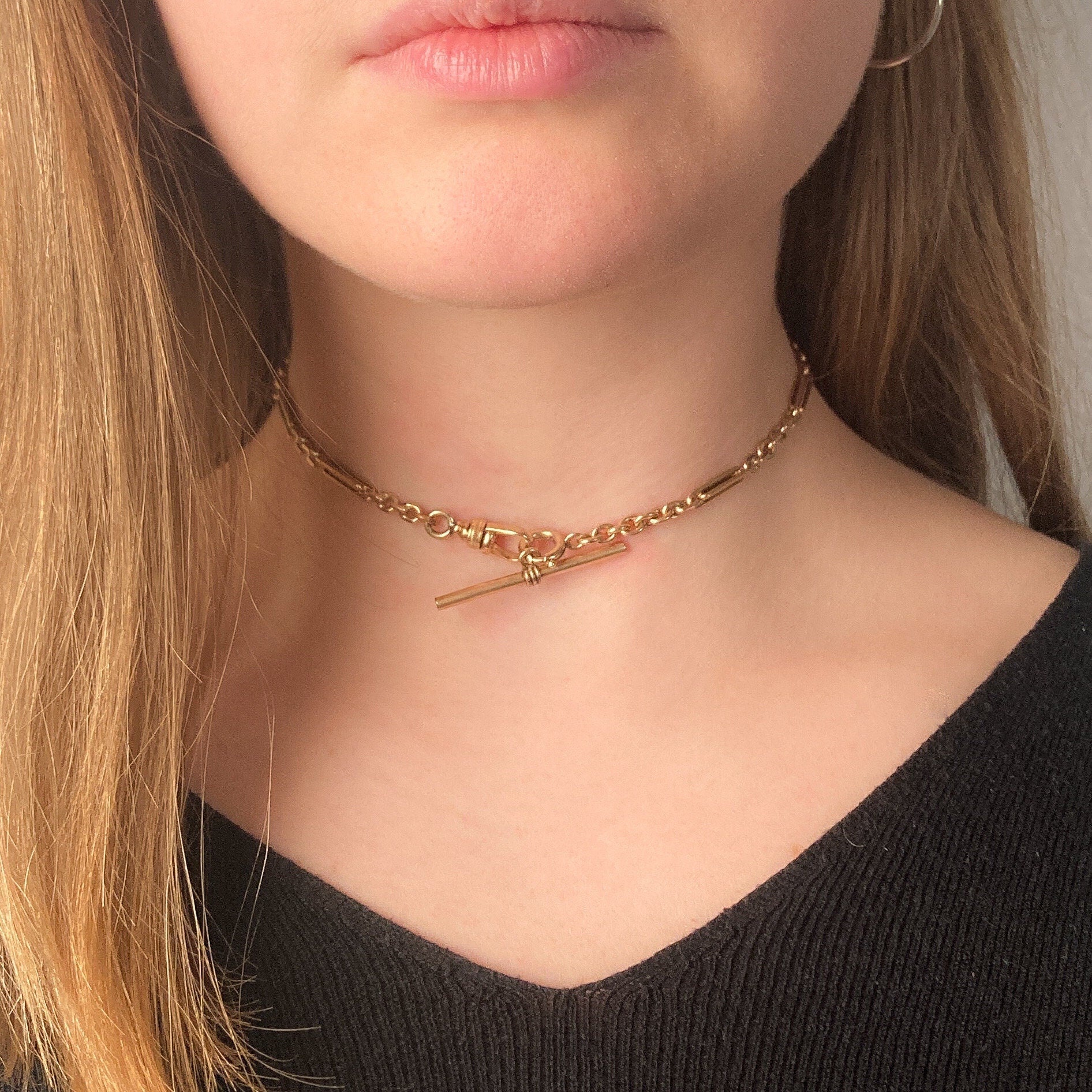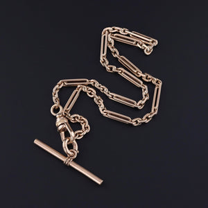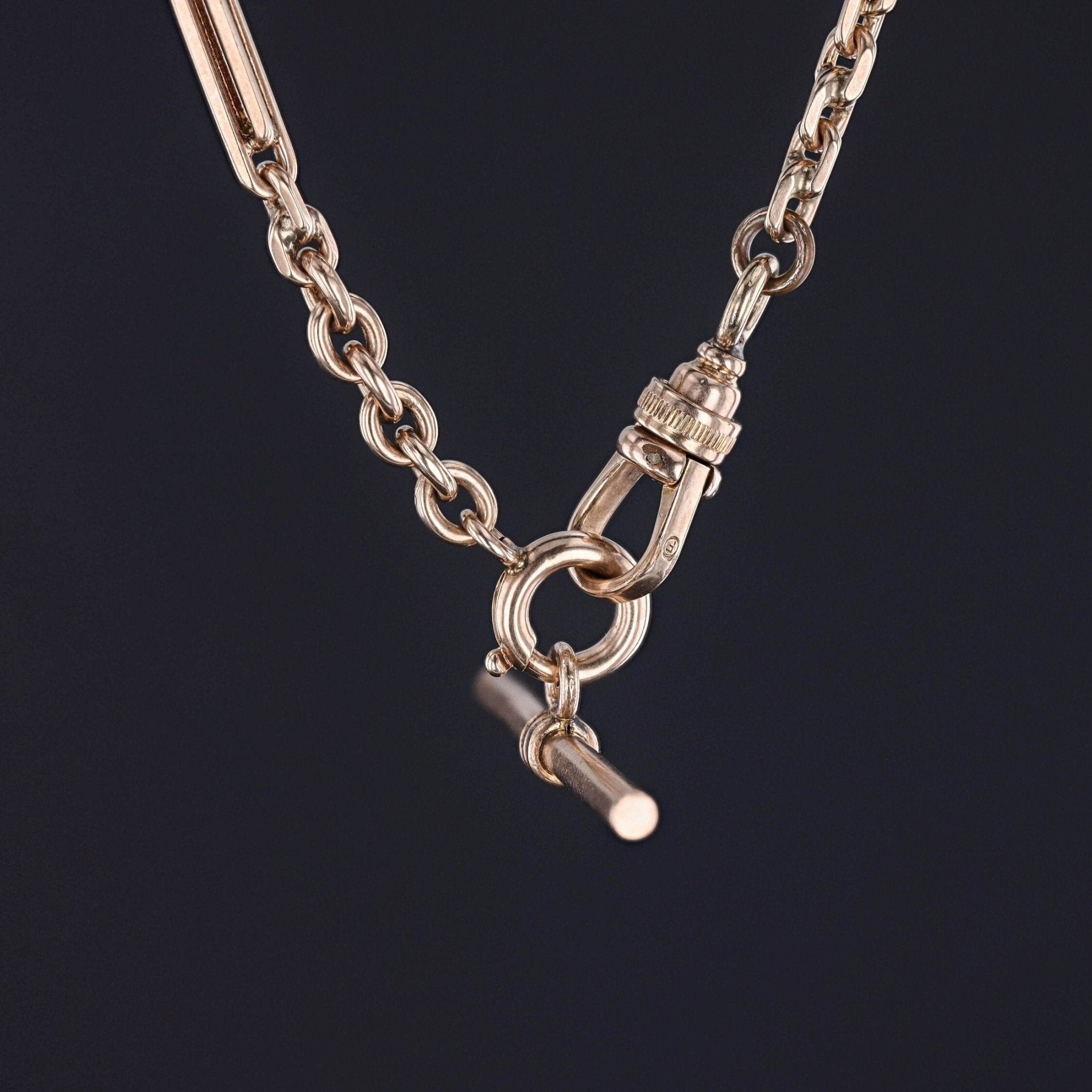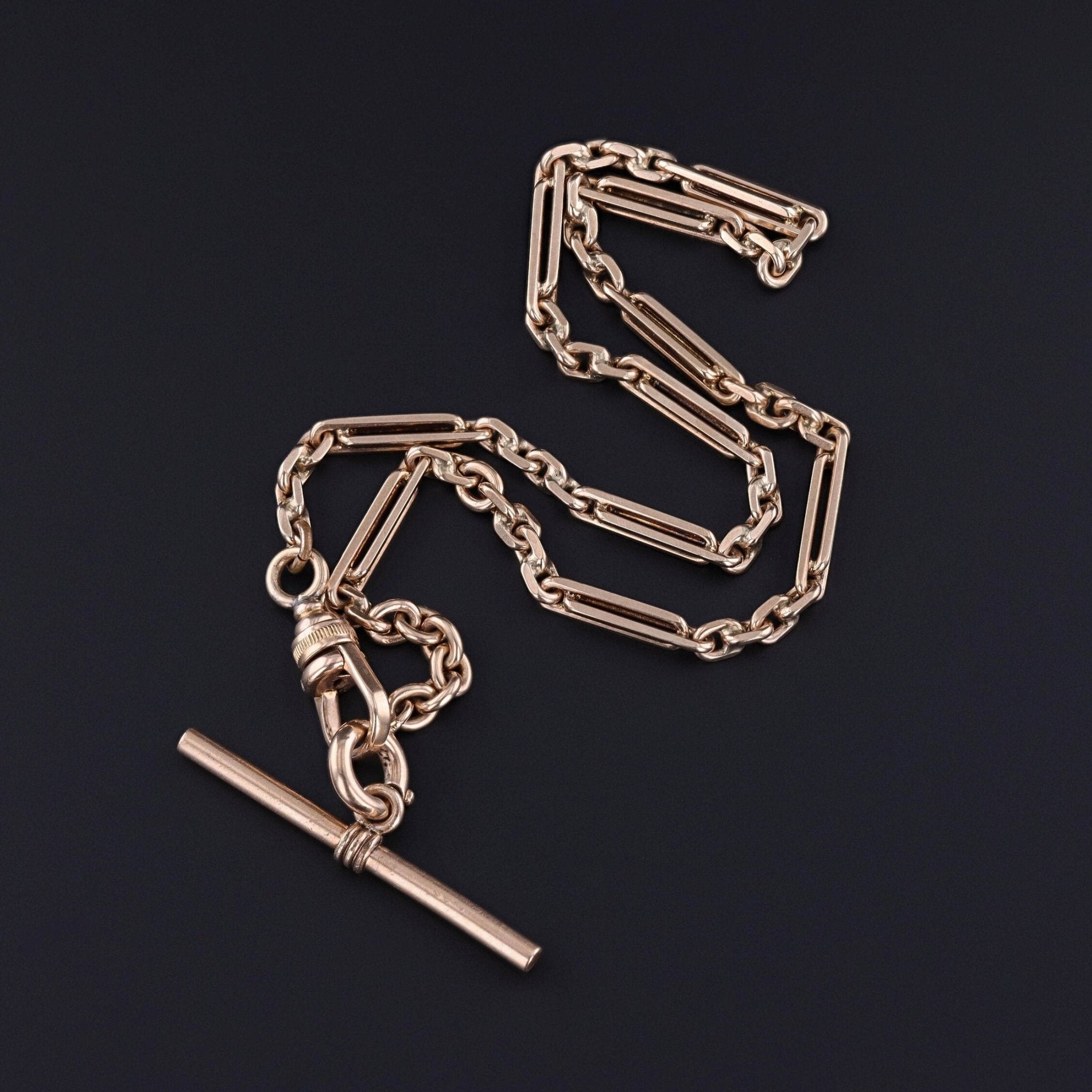 This antique watch chain (circa 1890-1910) features links of 9ct pale rose gold with a swivel clasp and t-bar. The piece can be extended by using a bit of additional chain or a brooch as a chain extender.
