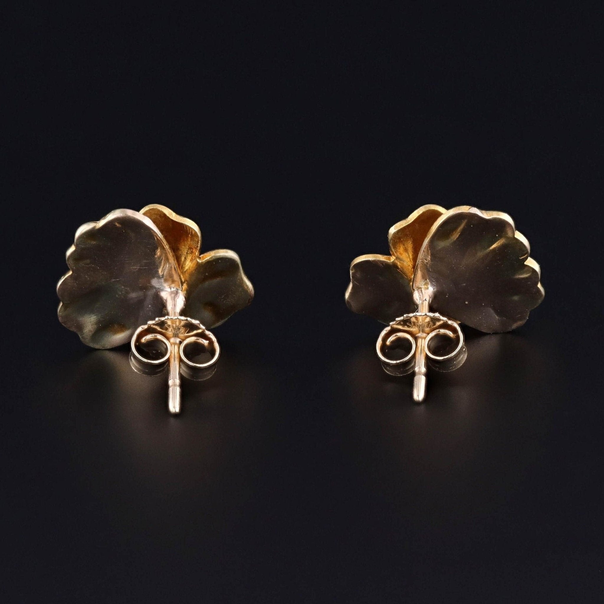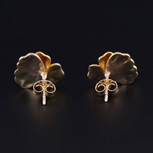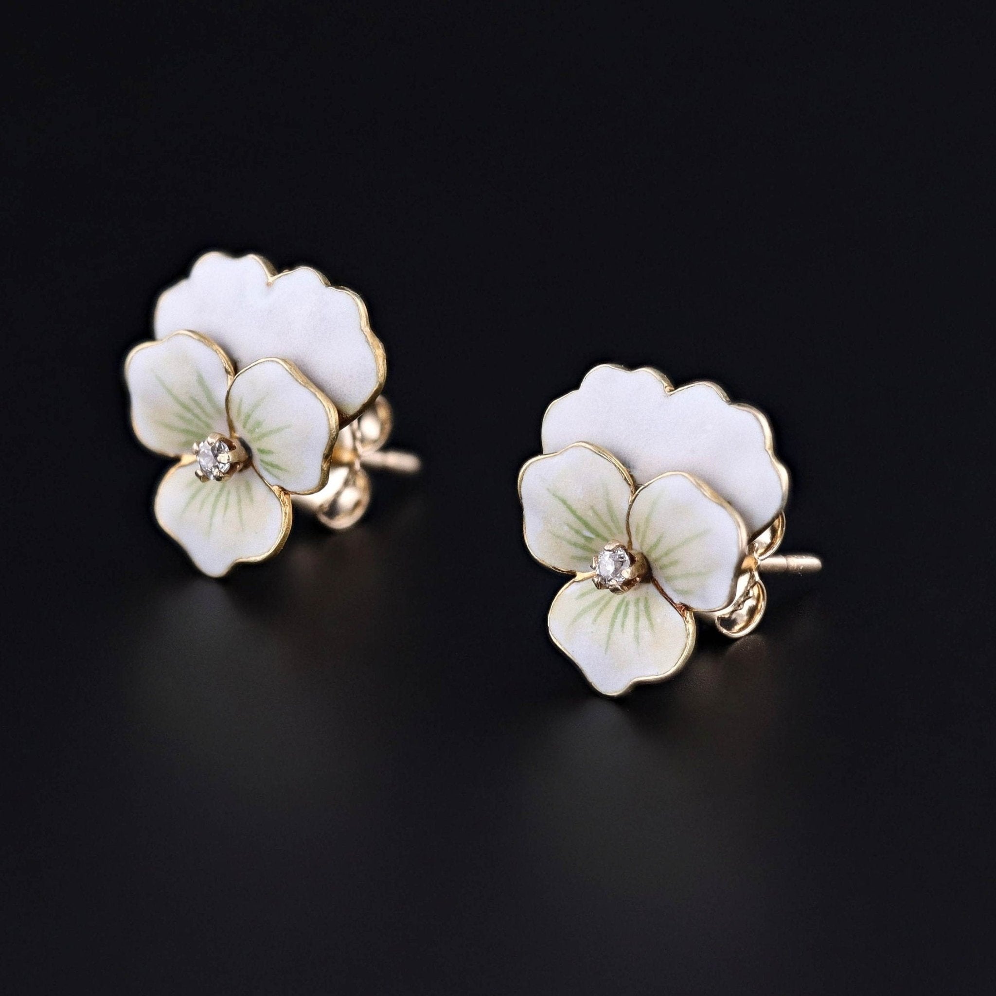 These antique earrings (circa 1920) feature 14k gold pansies with white enamel and diamond accents.