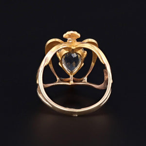 We created this one-of-a-kind ring by re-shaping part of an antique brooch (circa 1910) and adding a custom 14k gold band. The ring features a heart shape at its center accented with a captivating aquamarine, glistening diamond, and iridescent enamel.