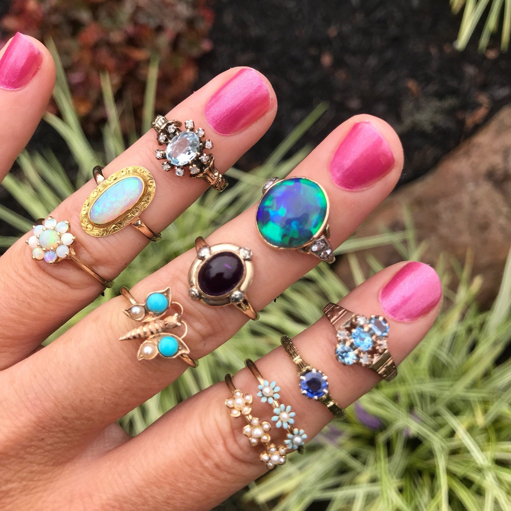 The ring mounting dates to the turn of the 20th century (circa 1890-1910). The original center stones were damaged, so we added three aquas in their place.