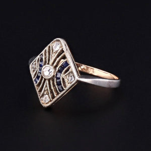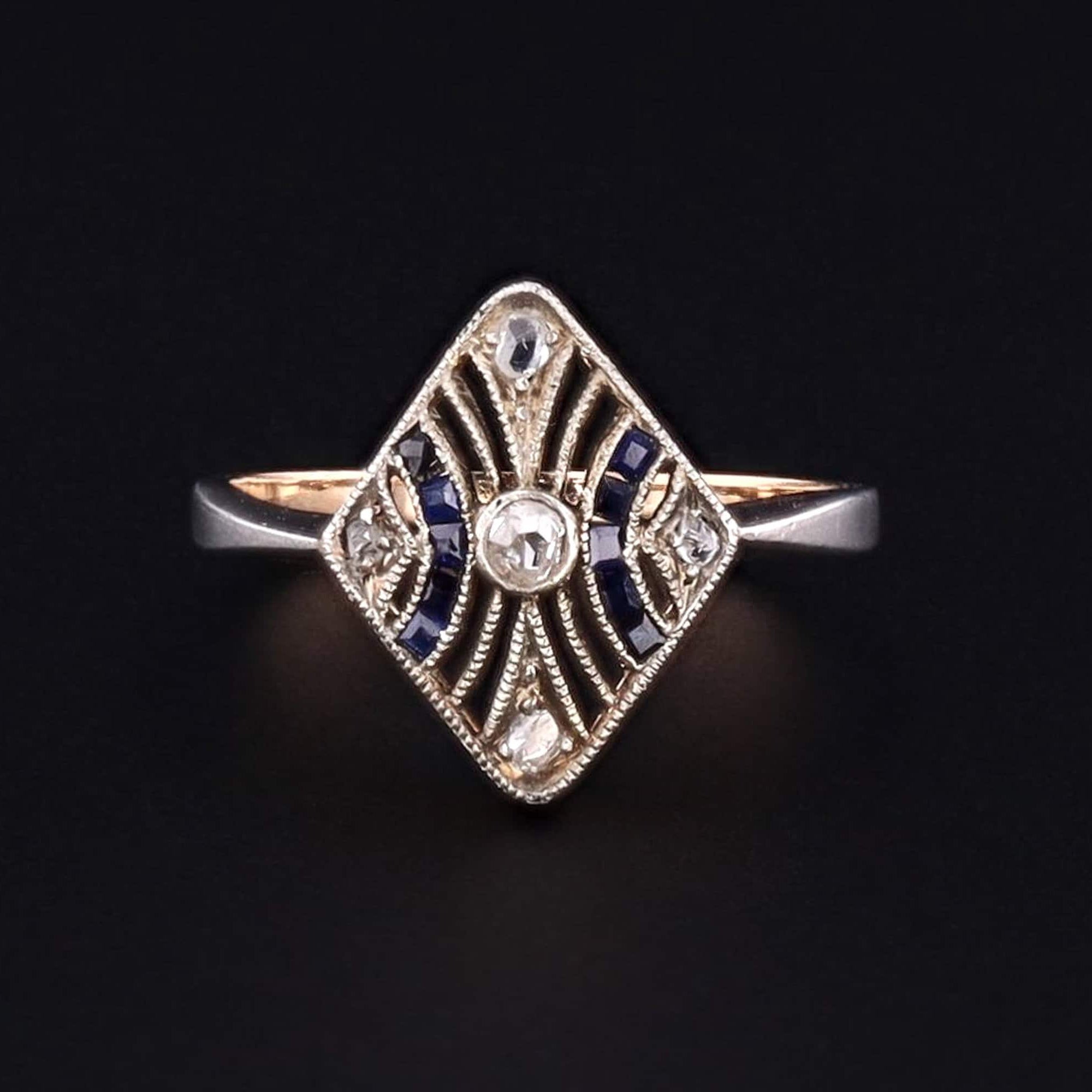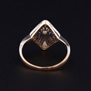 This delightful 14k gold ring is a mixture of yellow and white gold and features a five diamonds and ten synthetic sapphire accents.
