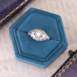 Exquisitely delicate and timeless, this vintage diamond ring features a domed filigree band with a graceful open-work floral design cascading along the sides—a romantic nod to early 20th-century craftsmanship and artistry.
