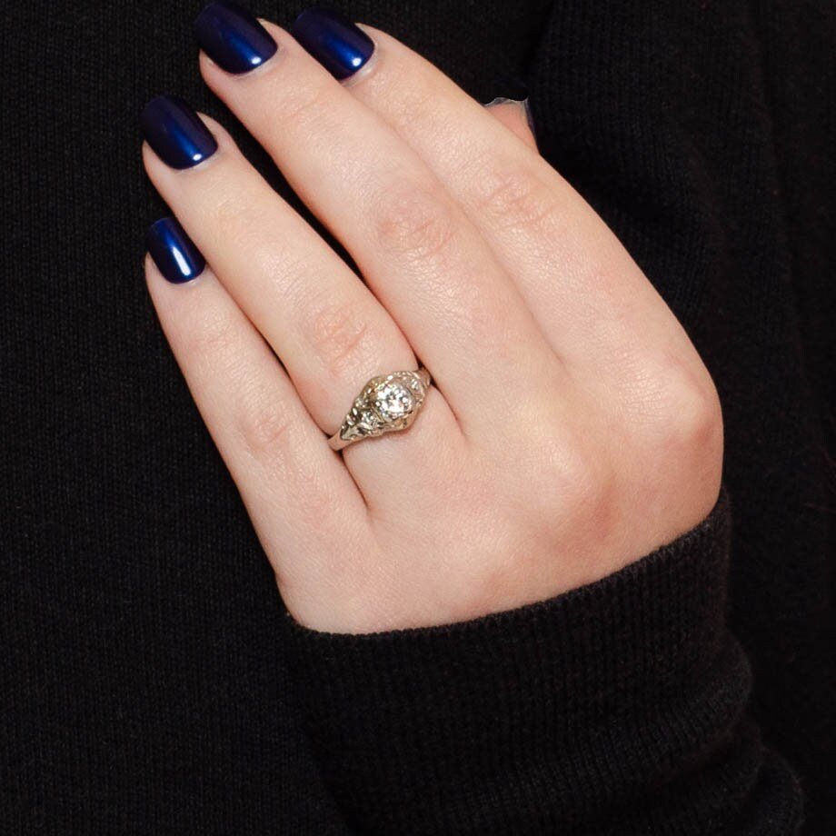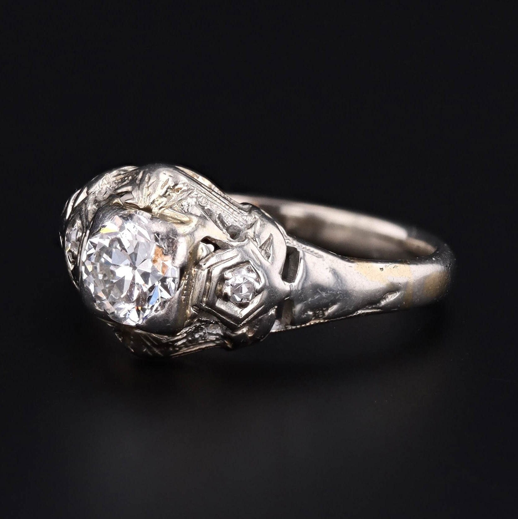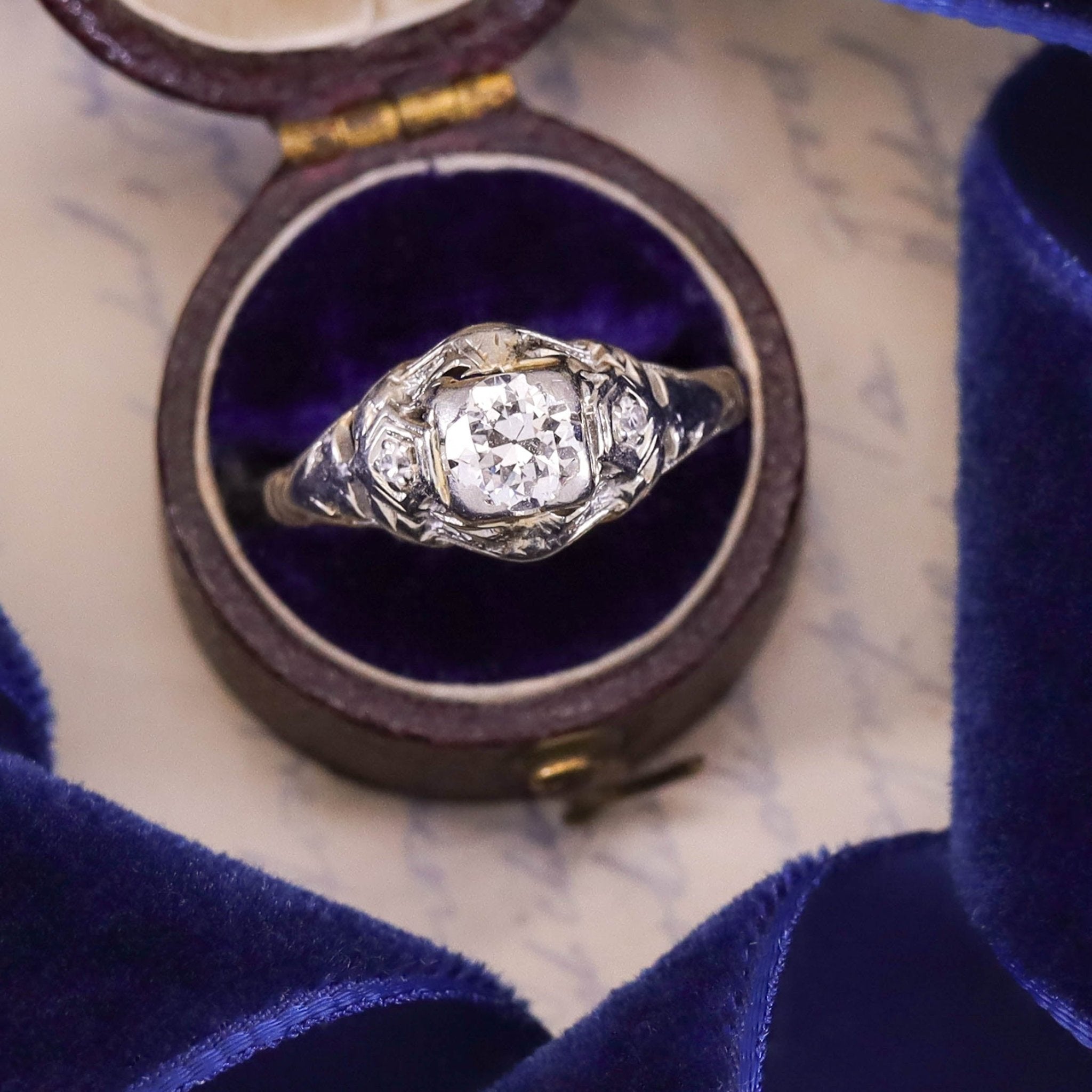 A refined jewel from the Art Deco era (1920-1930), this vintage engagement ring showcases a .53 carat round brilliant diamond of exceptional quality (F color, SI1 clarity) set in a finely detailed filigree mounting. Two side accent diamonds add an extra touch of sparkle, enhancing the ring’s timeless geometry and elegance.