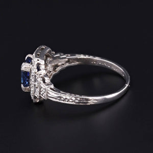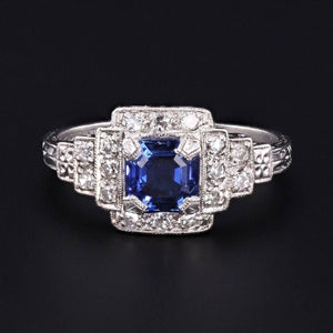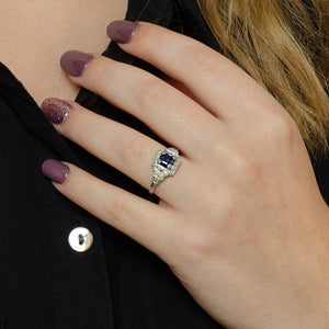 The vintage ring features a 1.3ct emerald cut natural blue sapphire with evidence of heat treatment and 16 round brilliant side diamonds of VS2-I1 clarity, G-H color with a total carat weight of 0.24ct.