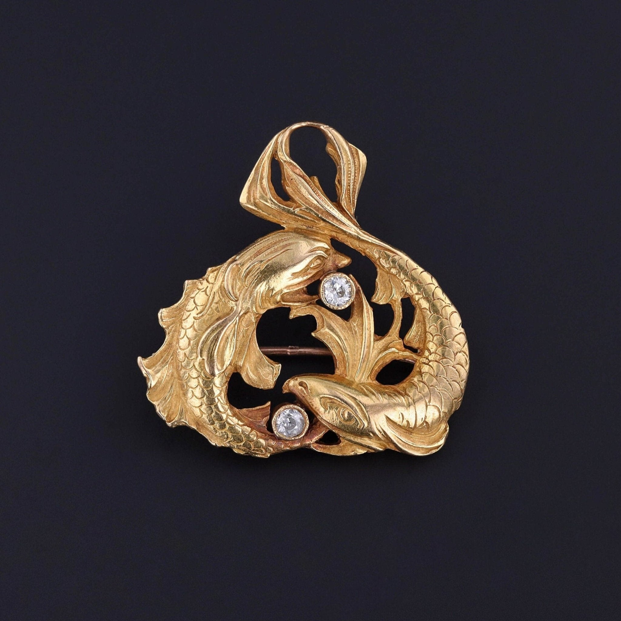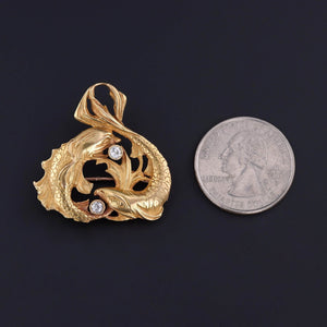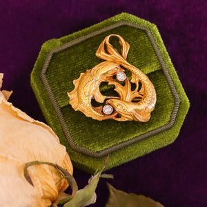 Symbolizing perseverance, harmony, and strength, this antique brooch (circa 1900) showcases a beautifully sculpted pair of koi fish, rendered in rich solid 18k gold and accented with sparkling old European cut diamonds. A fine example of turn-of-the-century design, this piece blends elegance with deeper meaning.