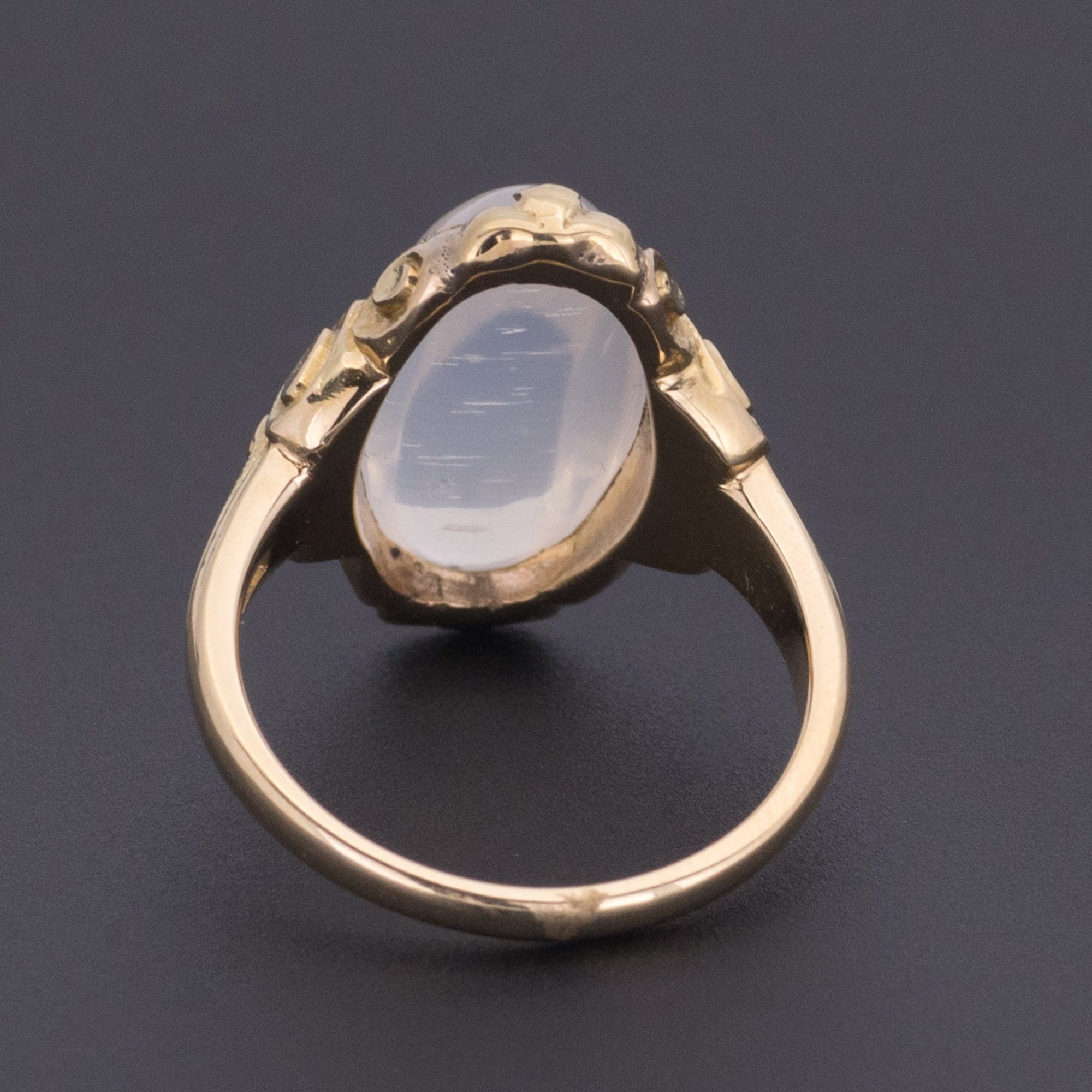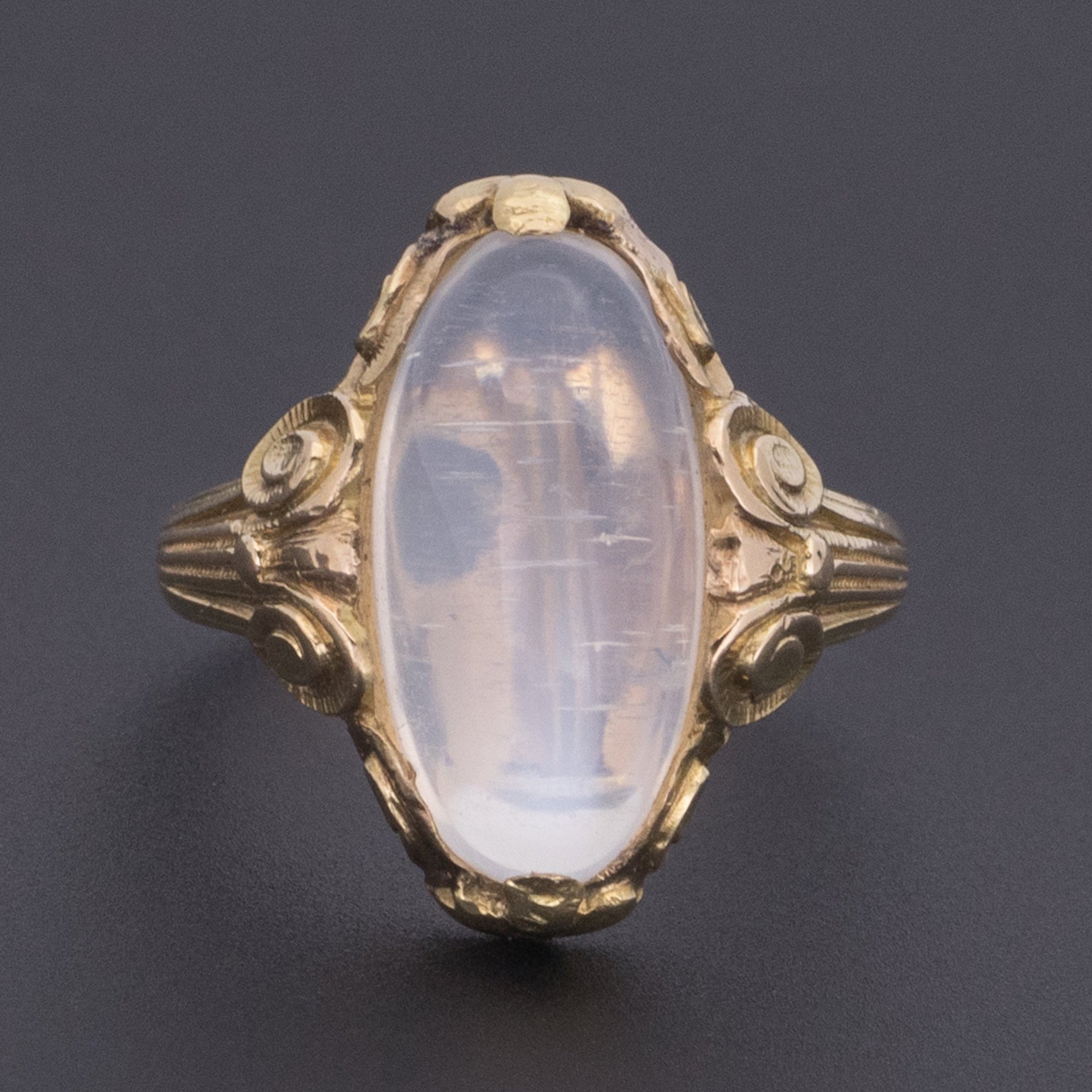 This stunning ring is hallmarked for Jones & Woodland Newark, NJ. This antique ring (circa 1910-1920) features a high domed moonstone cabochon mounted in 14k gold (marked).