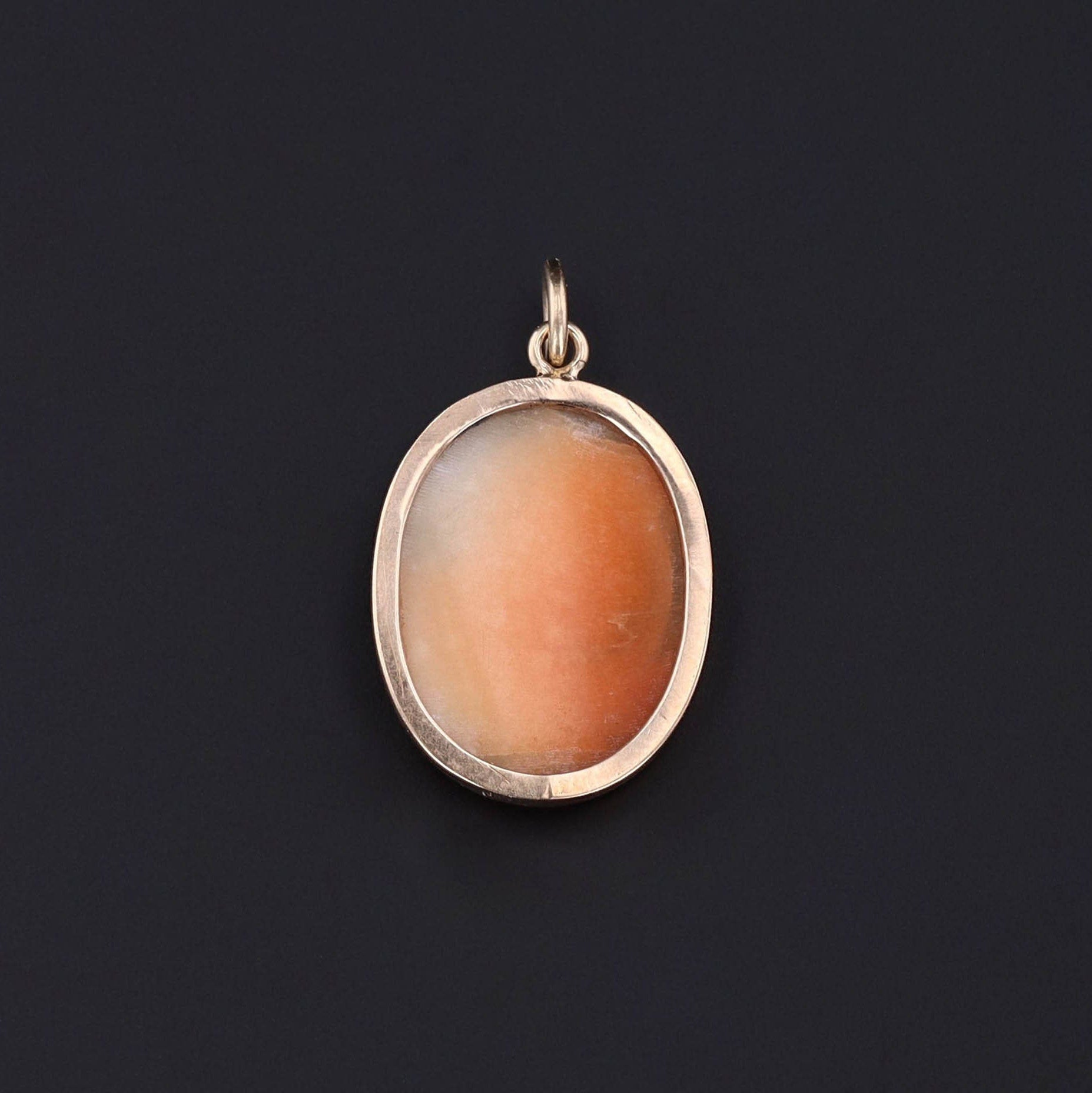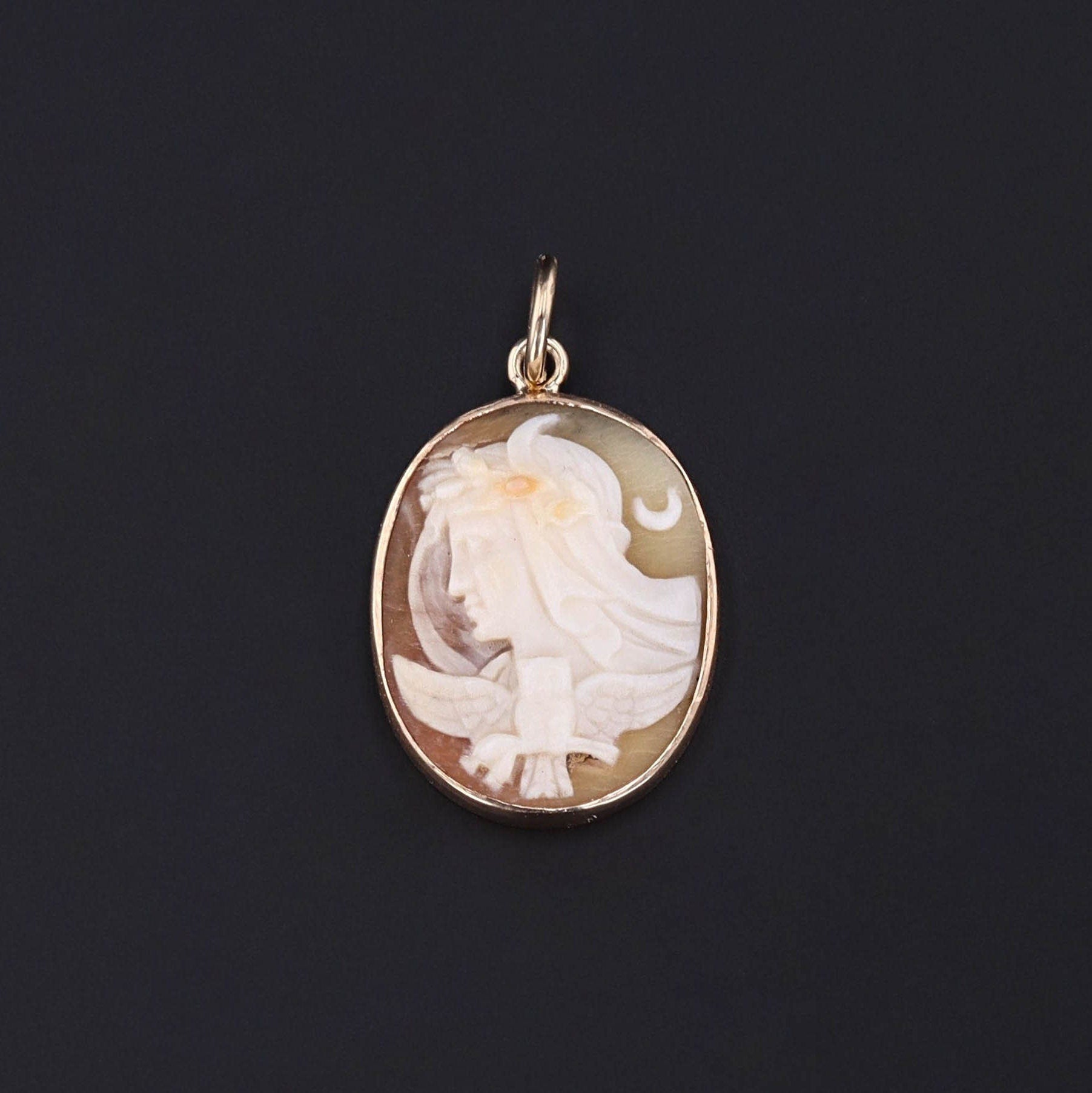 This pendant was converted from an antique stick pin (circa 1870) by removing the stem and adding a gold jump ring bail. It features a carved shell cameo of the goddess Athena mounted in 14k gold.