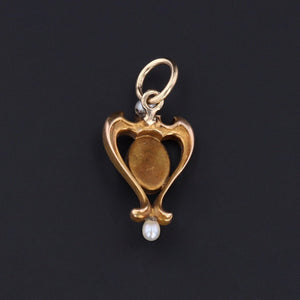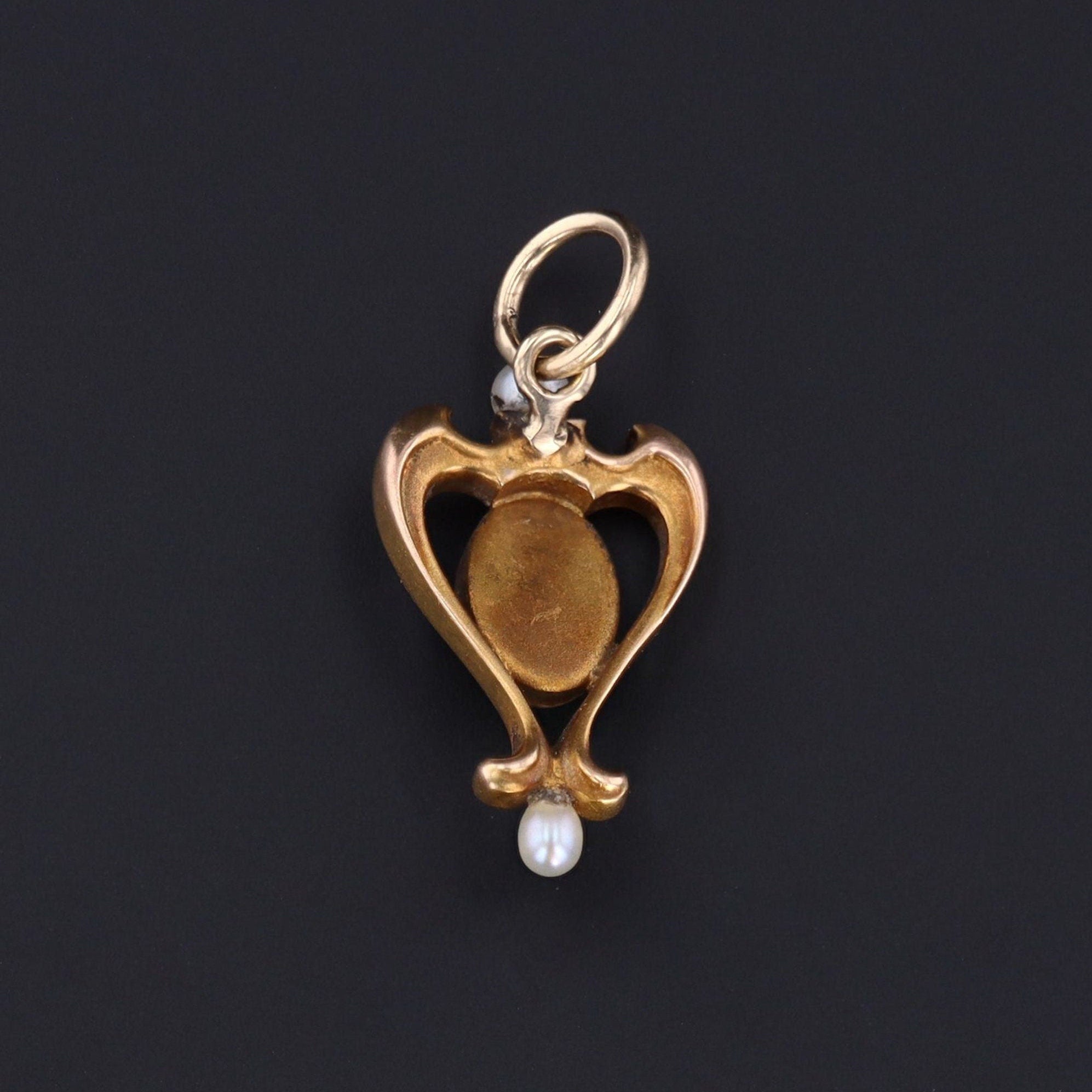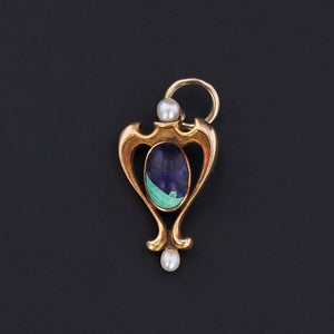 This adornment was created from an antique stick pin dating back to the early 1900s. It is 14k gold with a vibrant azurite malachte cabochon and lustrous white pearls.