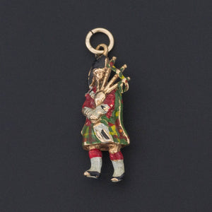 A vintage 9ct gold & enamel Scottish bagpiper charm -- perfect for anyone with a love of Scotland or a fondness for bagpipes.