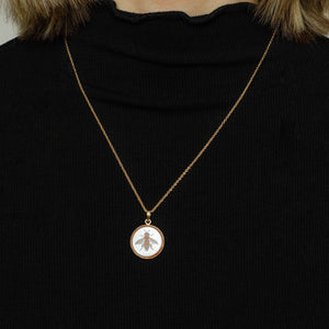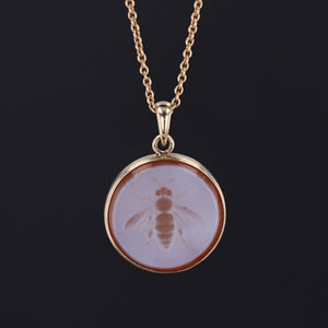 This pendant features a bee hand carved for us on a sardonyx stone that we upcycled from a vintage jewelry piece. The bee is mounted in 14k gold and we are providing the option to purchase the pendant with or without the 17 inch 10k gold chain depicted in the photos.