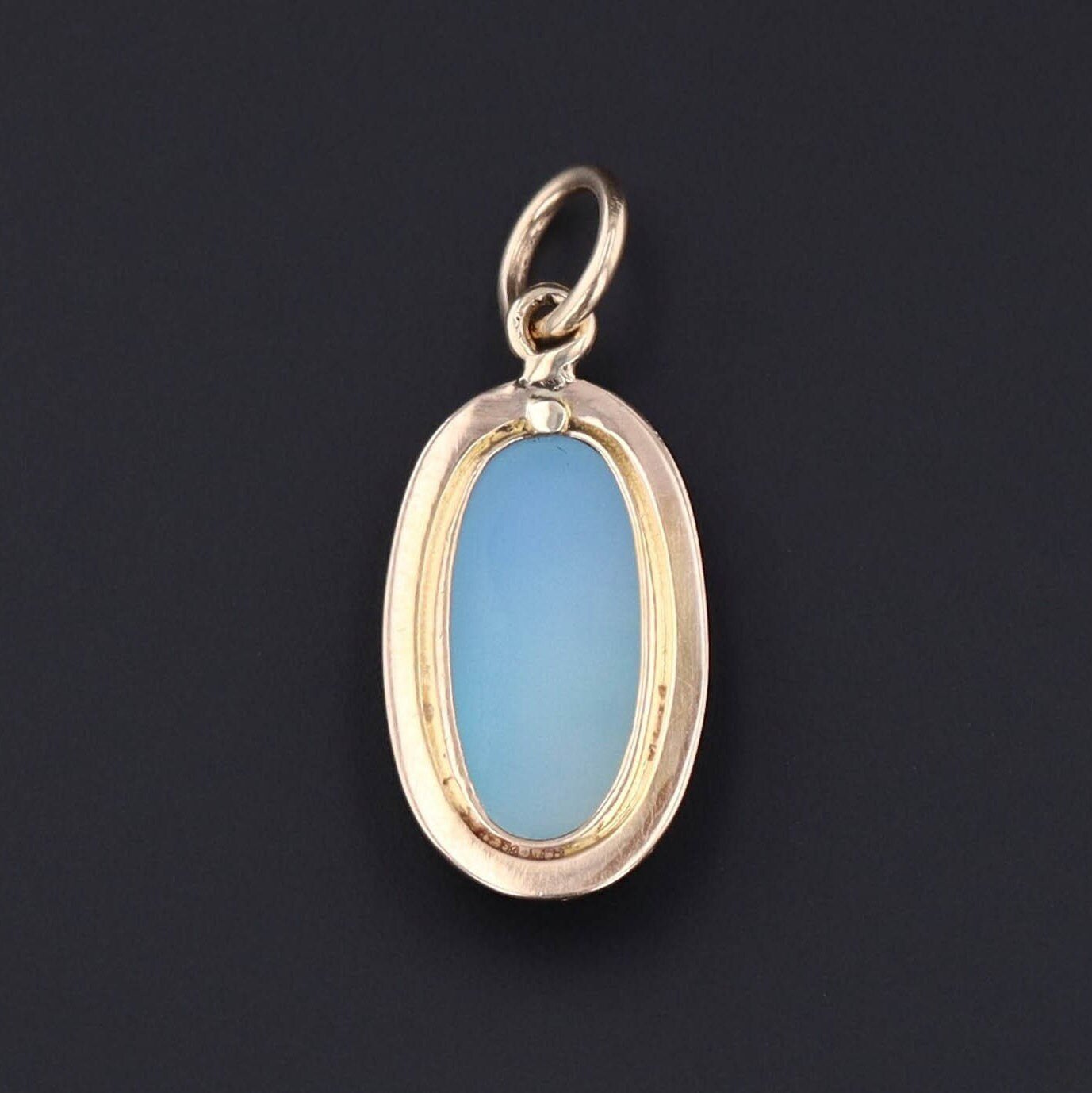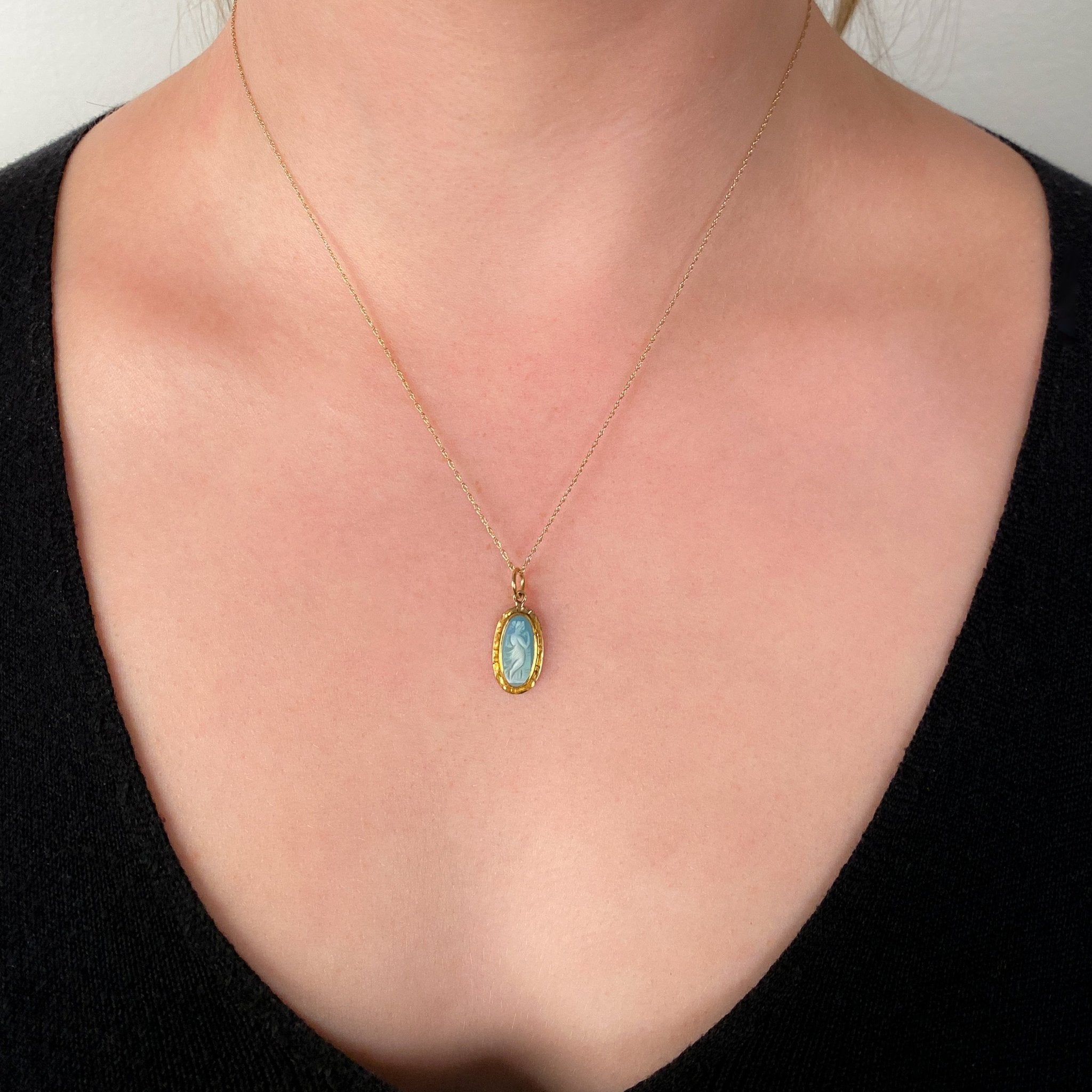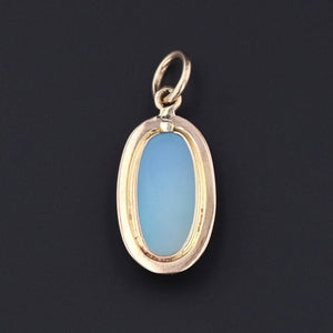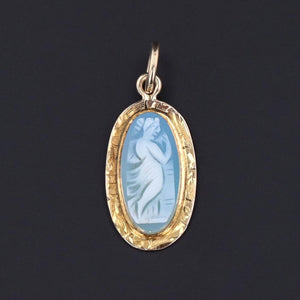 Delicately carved and classically beautiful, this antique charm (circa 1900–1909) features a cameo of a woman, finely carved from layered blue agate and framed in a warm 10k gold setting. The rich contrast between the soft white carving and the dusky blue background creates a timeless and elegant silhouette.
