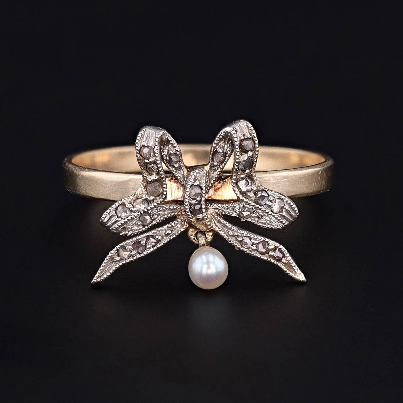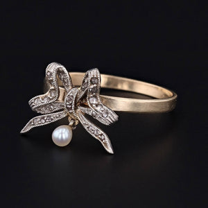 This ring was converted from an antique stick pin (circa 1910) by removing the pin stem and adding a 14k gold band. The ring features a platinum bow studded with rose cut diamonds with a single pearl dangling beneath.