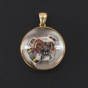 The bulldog is reverse painted crystal set in 14k gold and measures 0.9 inches from top to bottom by 0.65 inches wide. It was originally part of an antique pin (circa 1920-1930) transformed with the addition of a 14k gold bail. It is in very good condition.