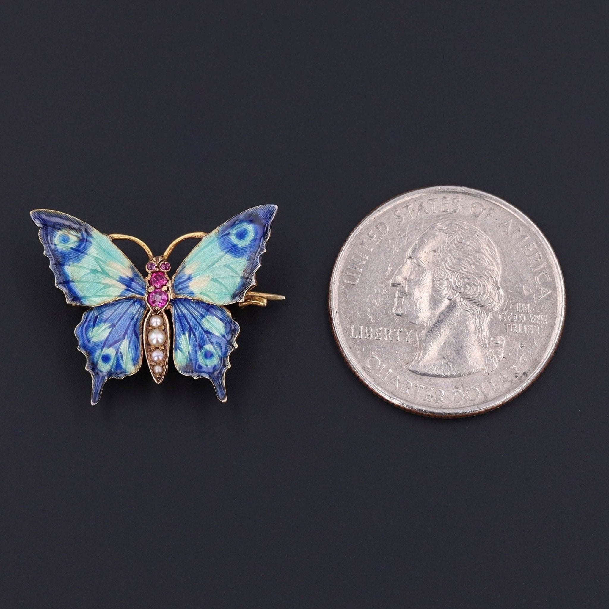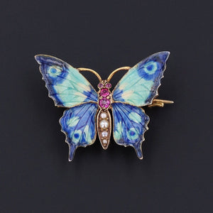 This antique brooch (circa 1910-1920) features a 14k gold butterfly adorned with beautiful blue and green enamel, rubies, and half pearls.