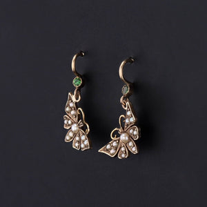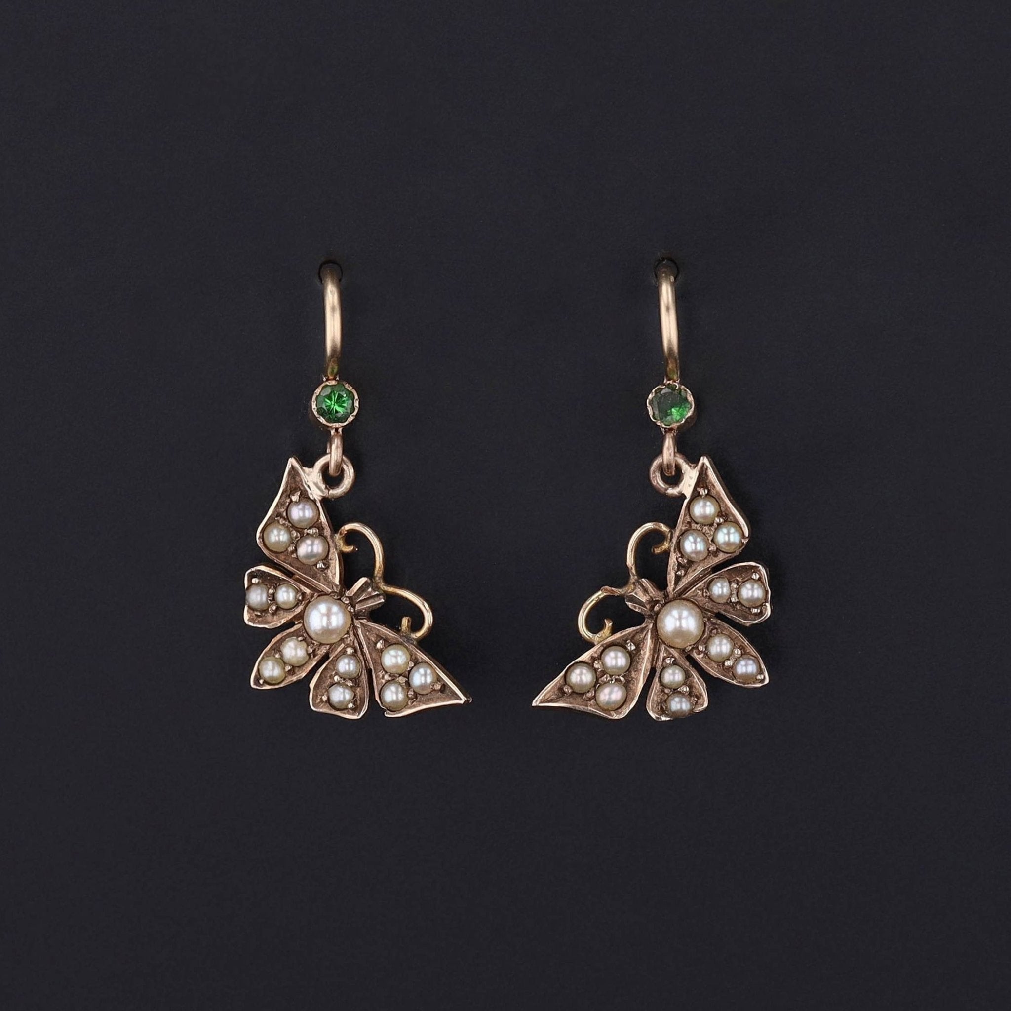 These whimsical earrings were created from an antique bar pin (circa 1890-1910). To create the dangles, our jeweler removed the 14k gold butterflies from the bar pin and added a 14k gold ear wire accented with a tsavorite garnet.