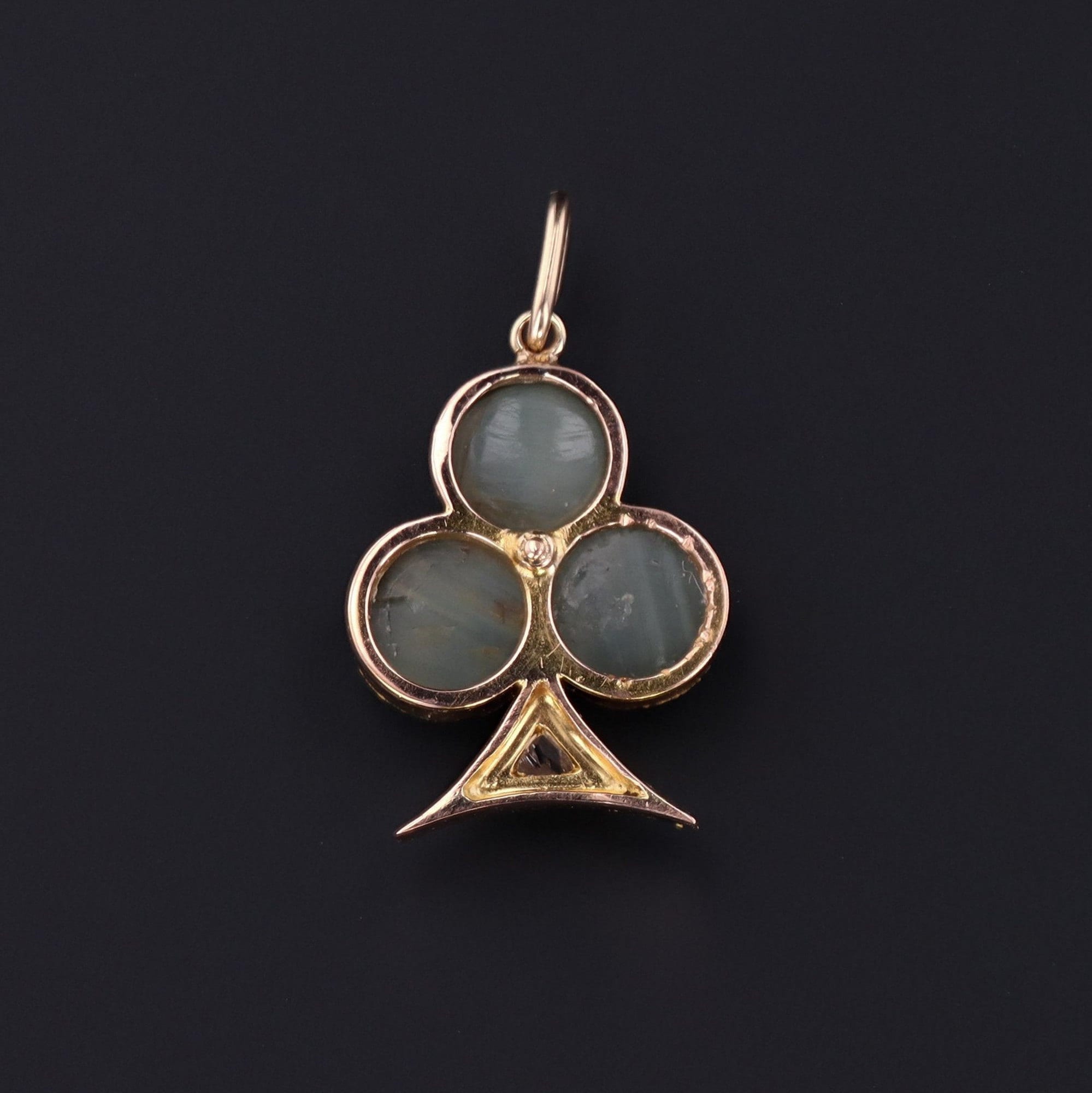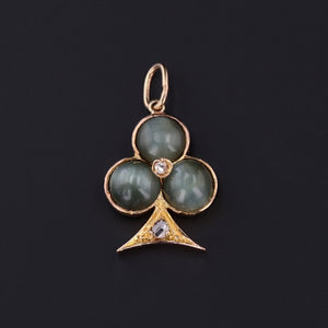 This trefoil charm features three cat's eye quartz stones and two rose cut diamond accents. The piece was originally an antique 14k gold stick pin (circa 1900) transformed with the addition of a 14k gold jump ring bail.