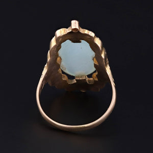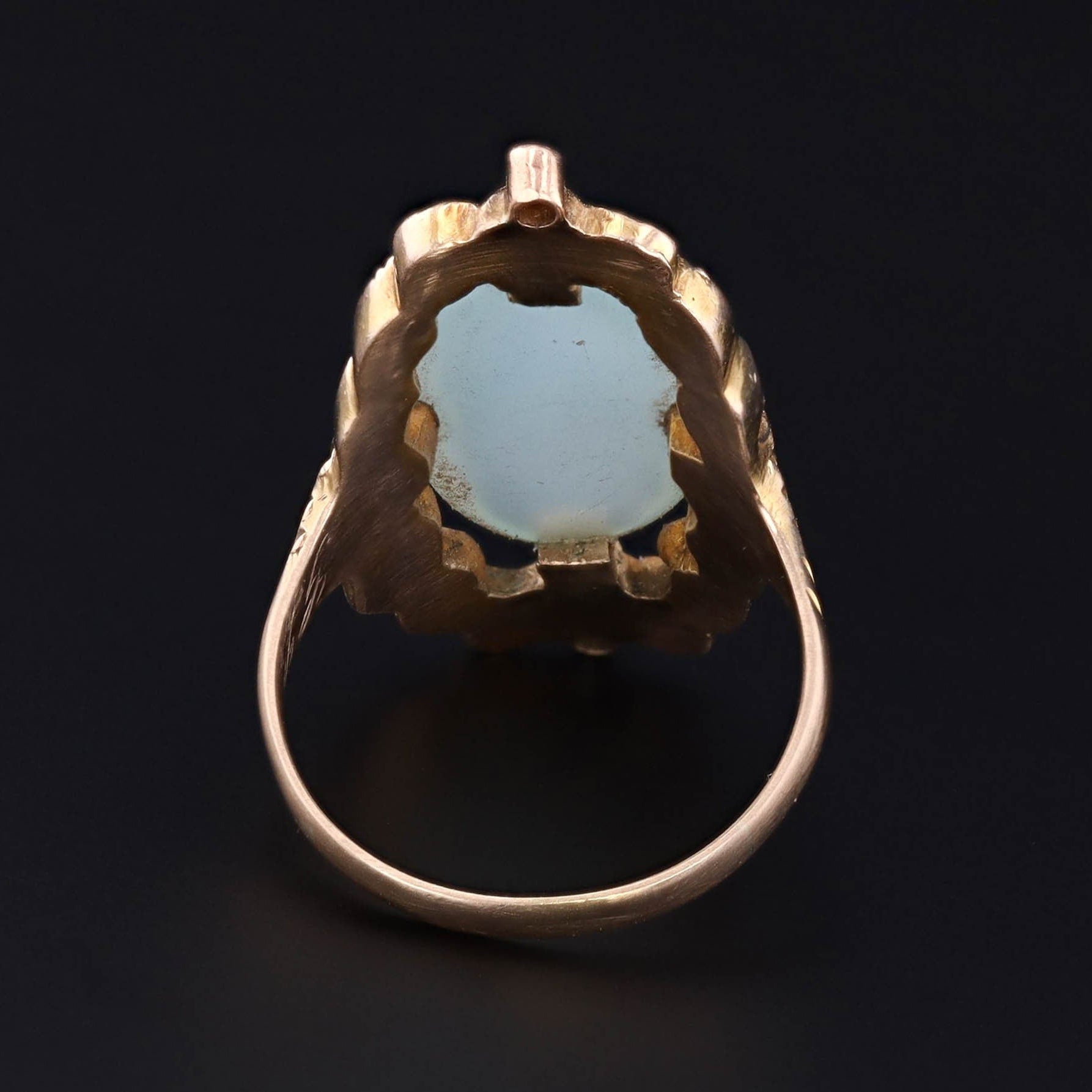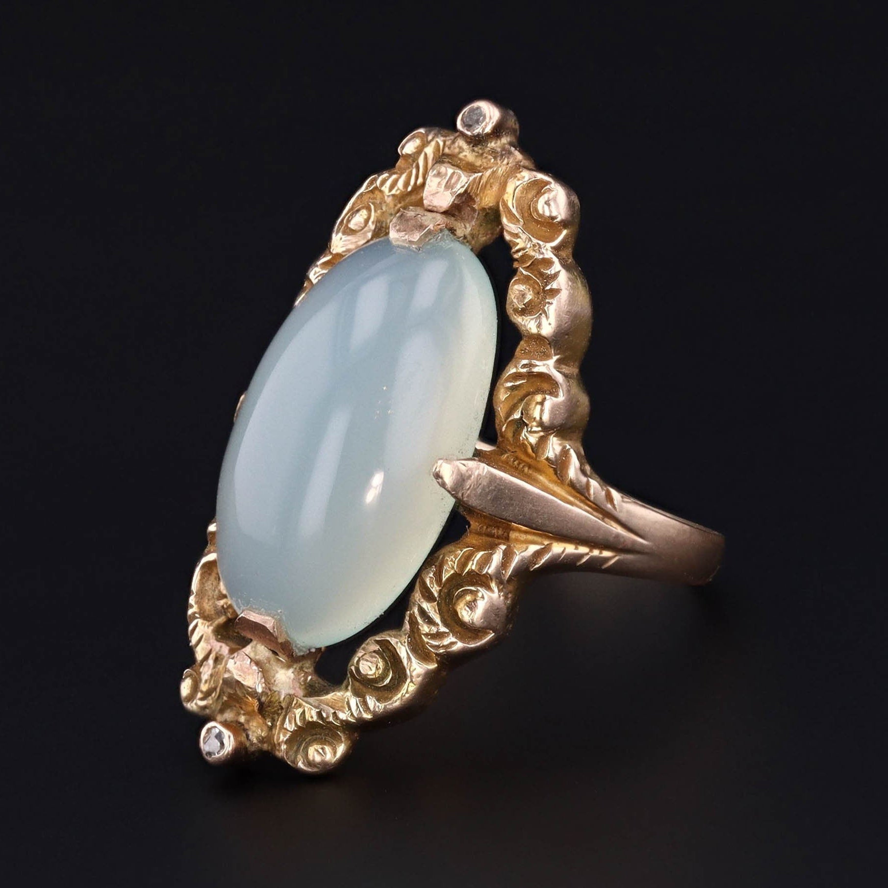 The elegant chalcedony ring delights with its subtle green hues and tiny sparkling diamond accents. The mounting dates to the Art Nouveau era (circa 1910), while the chalcedony cabochon is a later replacement stone.