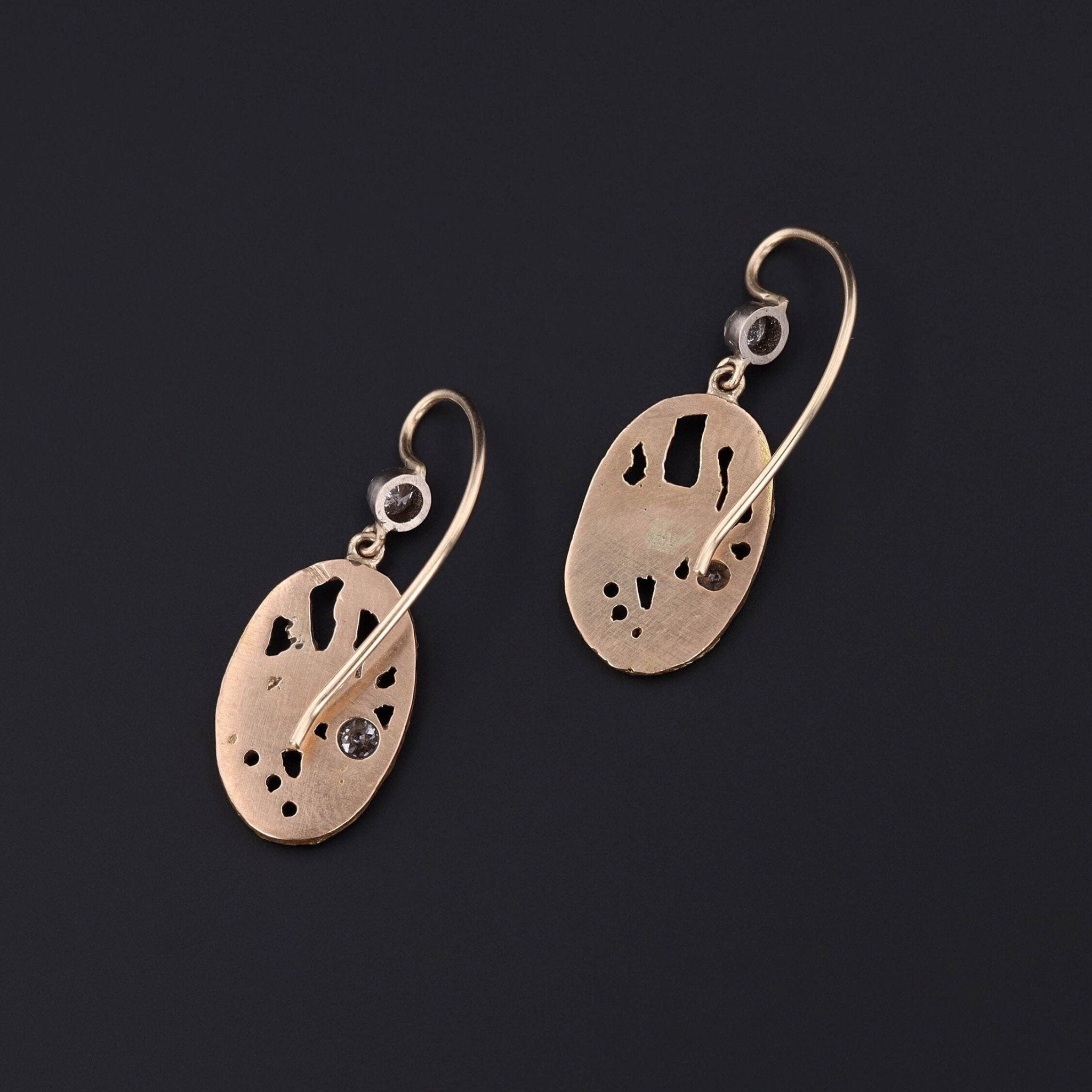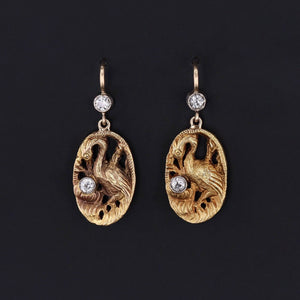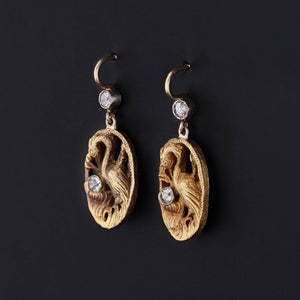 These elegant earrings were converted from antique 18k gold cufflinks (circa 1900-1915). The dangles feature cranes with diamond accents and new 14k gold ear wires.