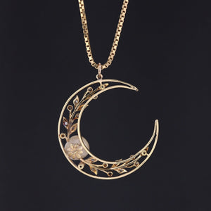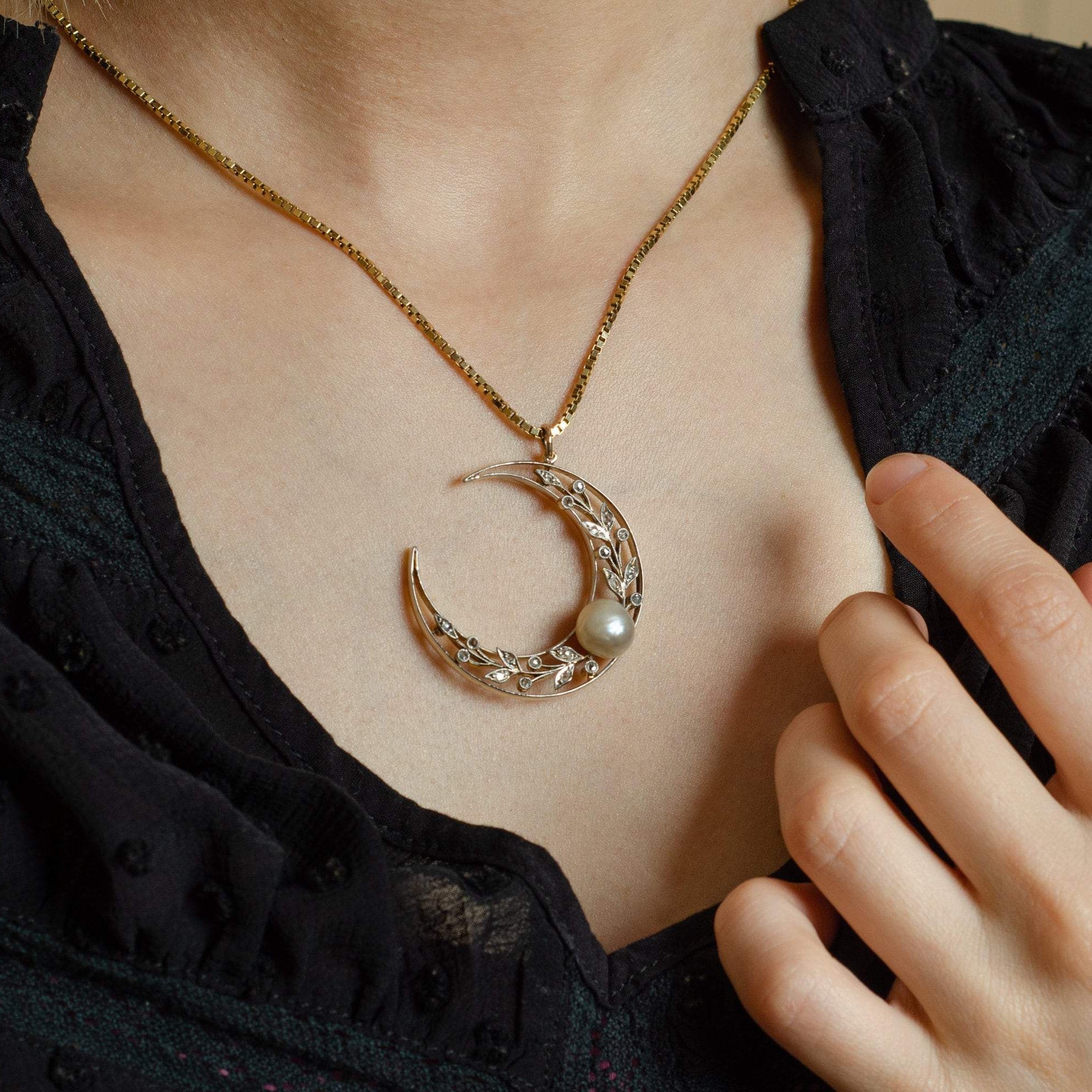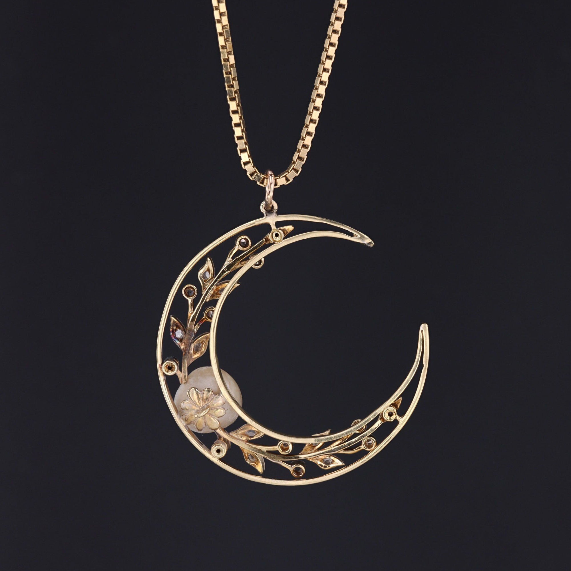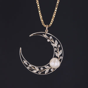 This antique crescent moon pendant was once an antique brooch (circa 1900-1915) transformed with the addition of a 14k gold jump ring bail. The pendant is platinum topped 14k gold and accented with a natural pearl and tiny diamonds.