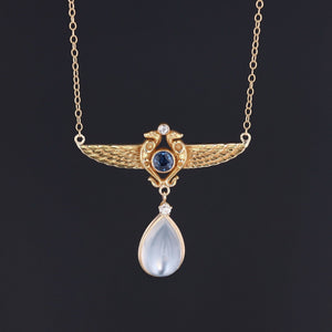 The center component depicts two birds with outstretched wings with sapphire and diamond accents and a shimmery moonstone drop. The entire piece is 14k gold.