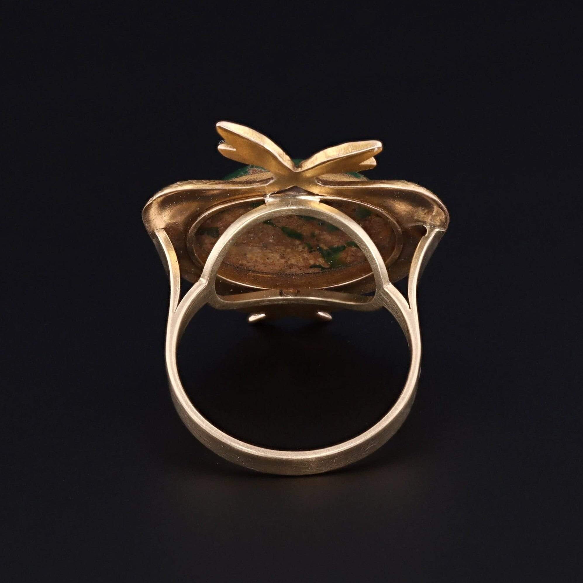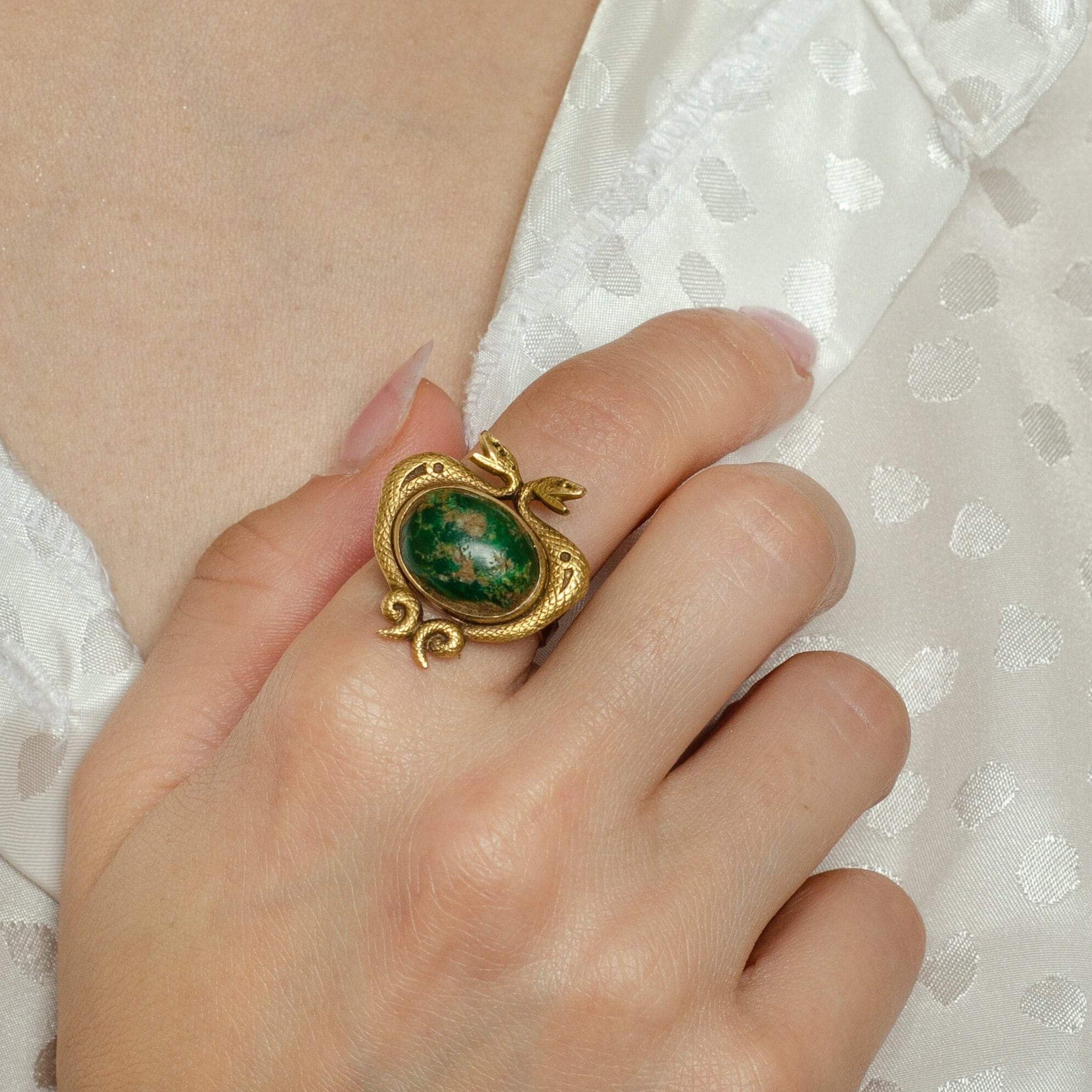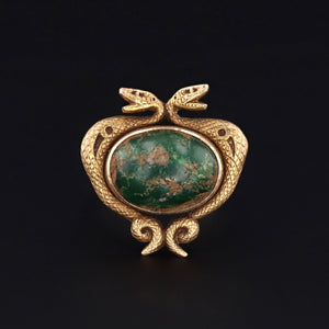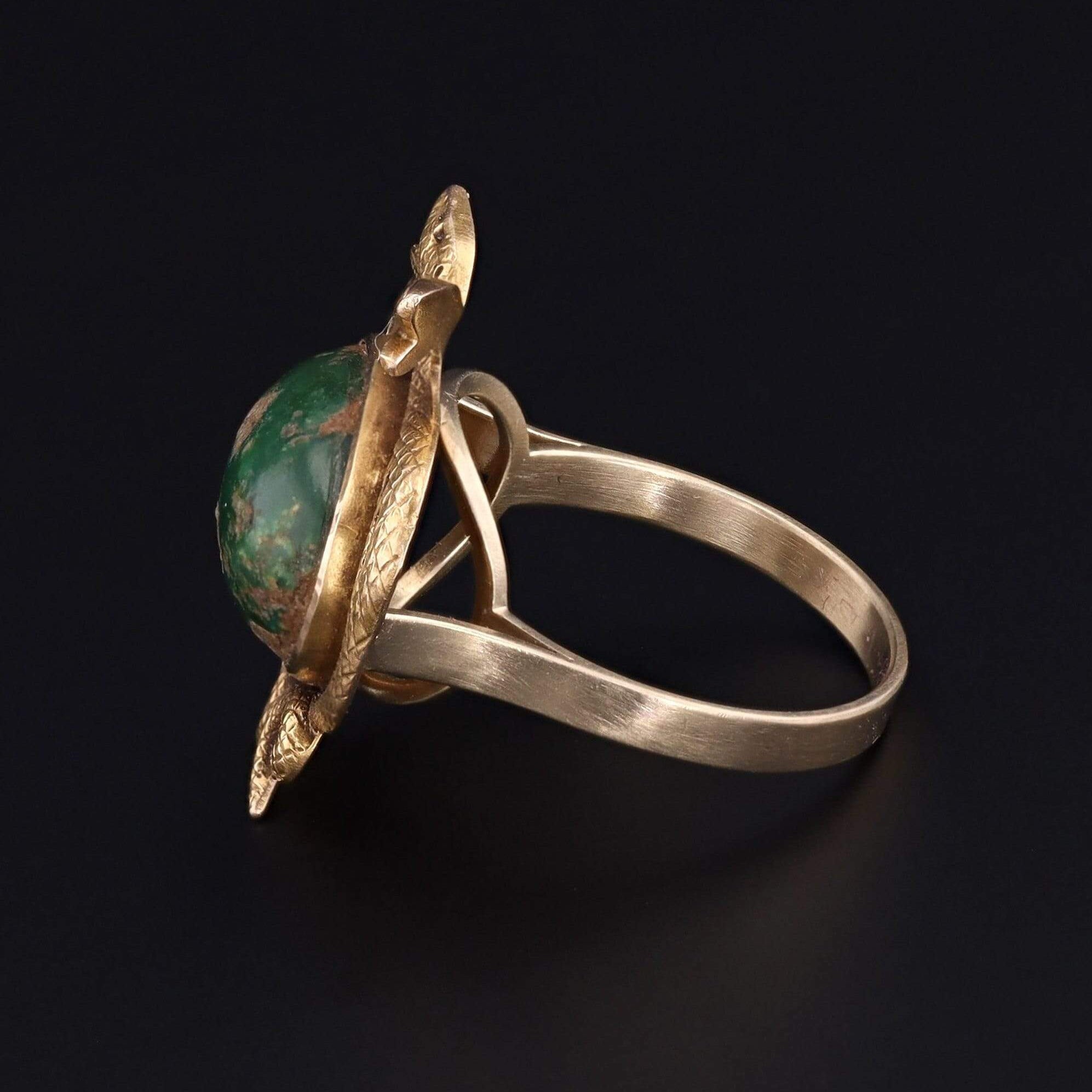 A striking double dragon ring with an earthy, green-hued turquoise cabochon.