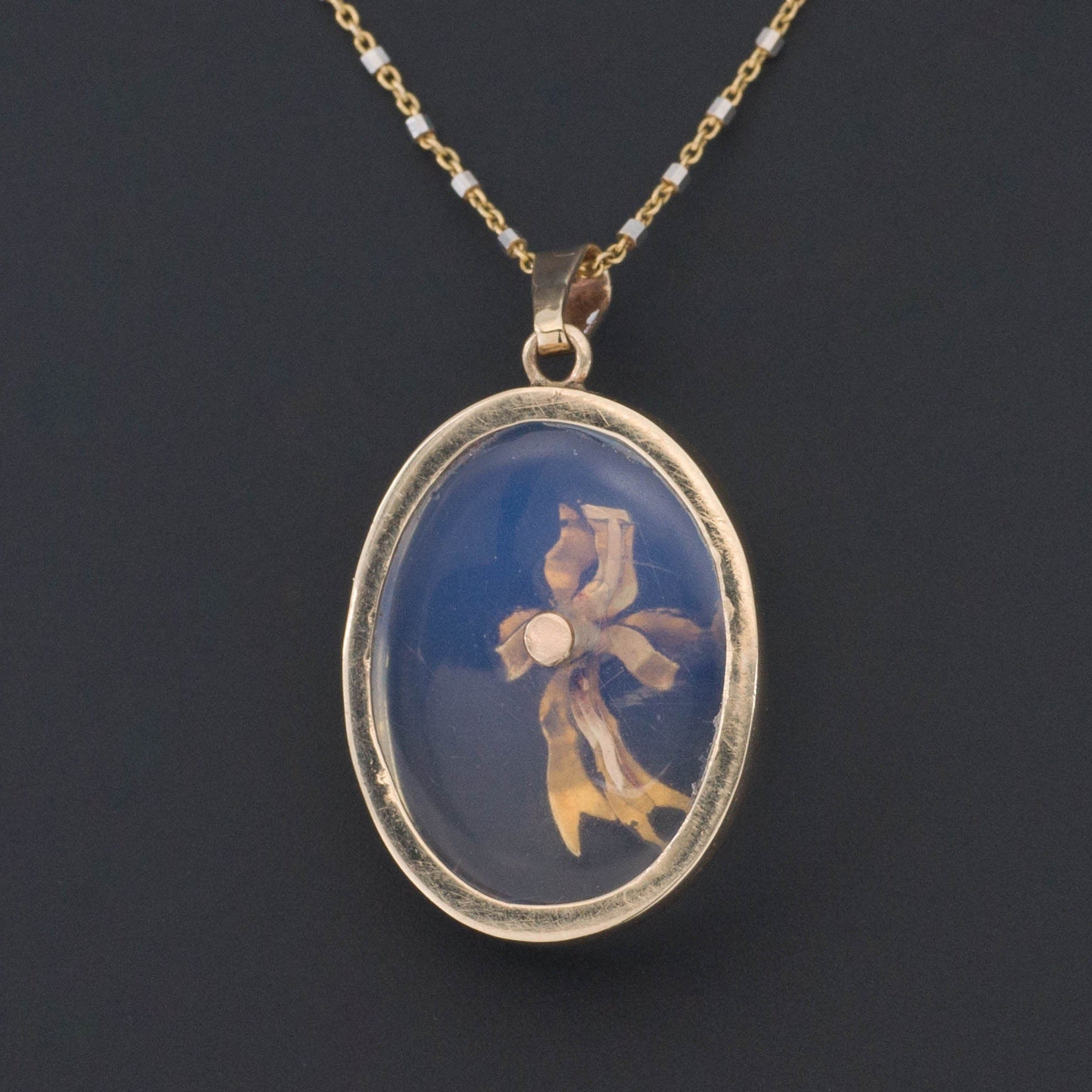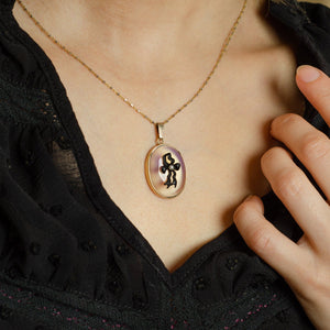 This one of a kind piece was created from a 1960s era 9ct gold pendant and an antique 14k gold black enamel stick pin.