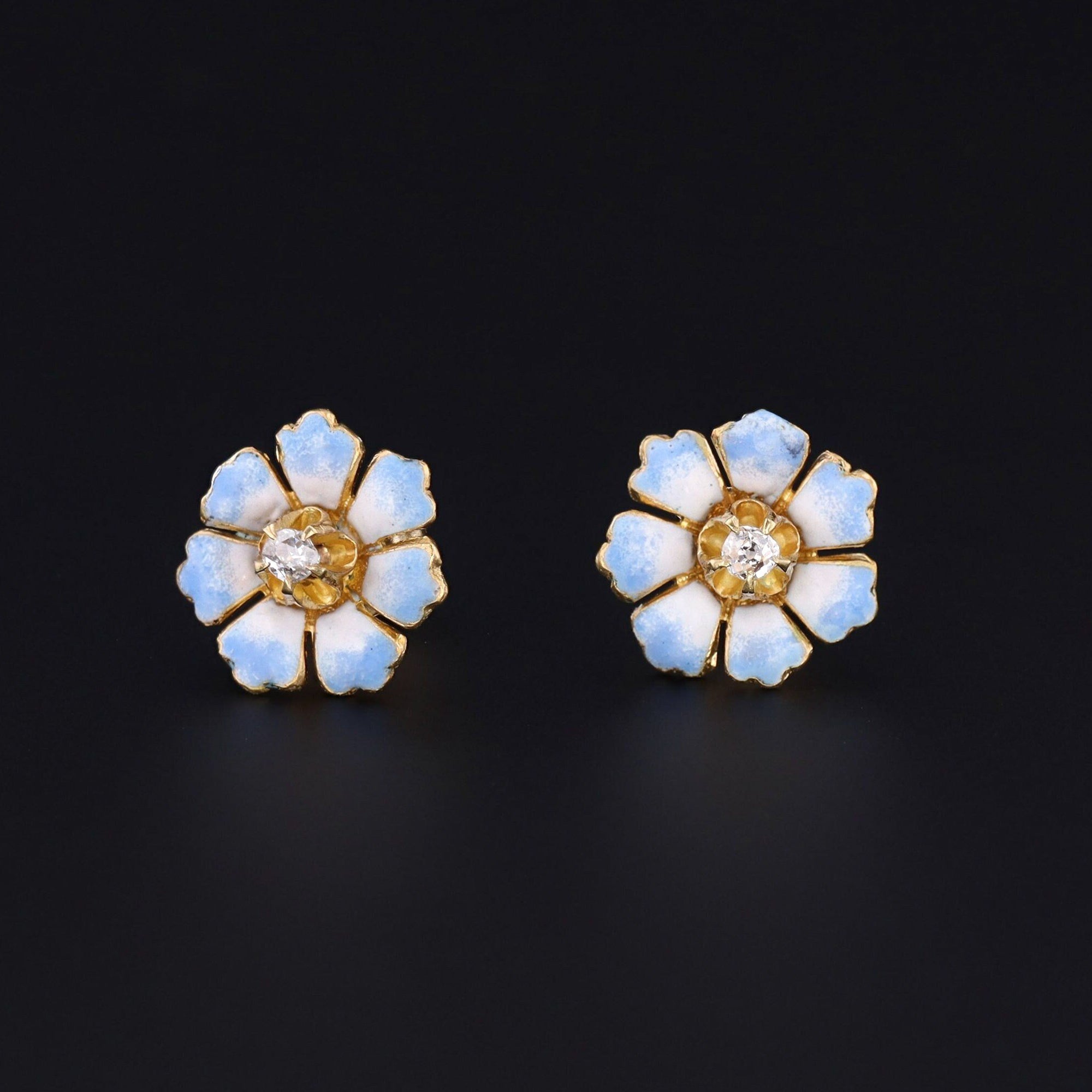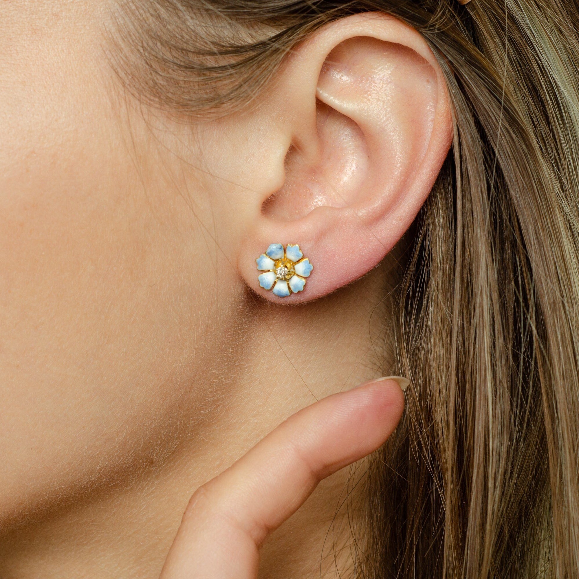 Delightful blue enamel flower earrings with glistening diamond accents.