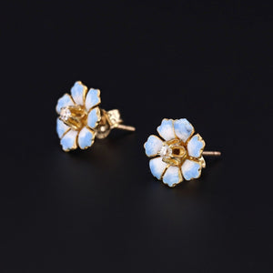 The earrings are 14k gold and measure 0.4 inches in diameter. They are in very good condition with one small chip to the enamel (visible only under magnification).