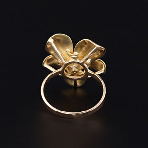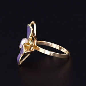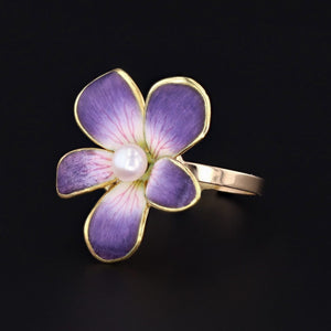 The violet is 14k gold with purple and white enamel petals with a lustrous pearl center. The face of the ring measures 0.85 inches from north to south by 0.7 inches from east to west.