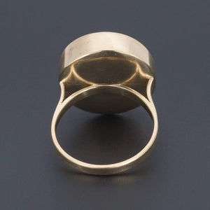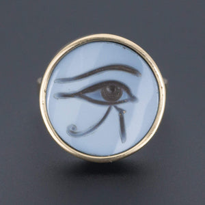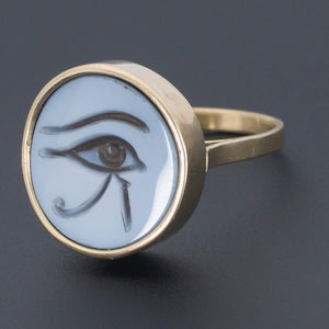 This intriguing ring features a hand carved banded agate intaglio depicting the Eye of Horus in a custom made 14k gold mounting.