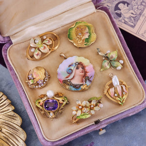 In very good condition, with only minimal enamel loss visible under close inspection, this piece is a graceful example of American Art Nouveau jewelry—celebrated for its blend of natural motifs, masterful enamel work, and refined elegance.