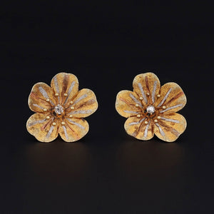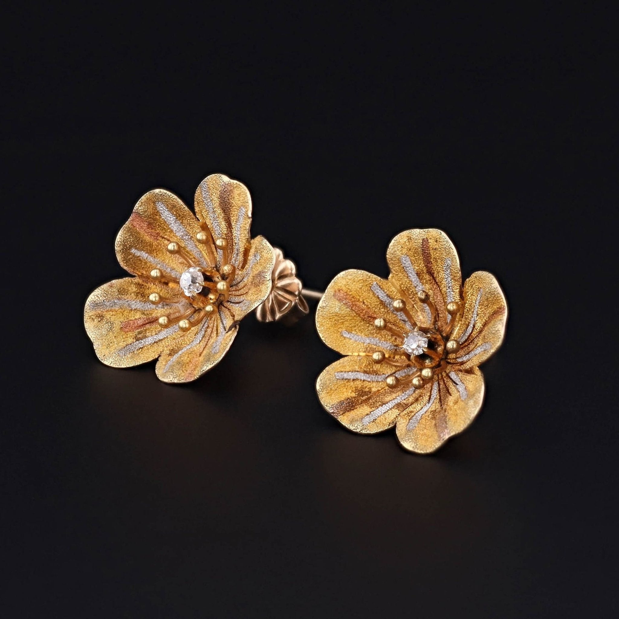These elegant 14k gold earrings were created from an antique brooch (circa 1900) and feature tri-color gold flowers with diamond accents at their centers.