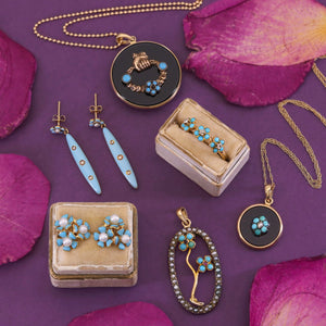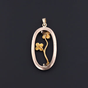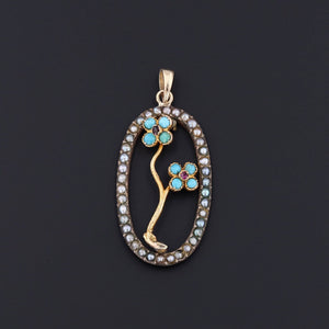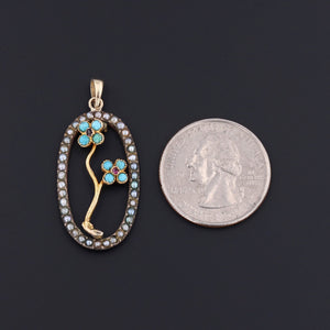 This pendant was converted from an antique 14k gold pin (circa 1910) by removing the pin and adding a 14k bail. The piece features turquoise and ruby forget-me-not flowers set inside a pearl frame.