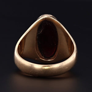 The vintage ring (circa 1960) features a garnet cabochon mounted in a substantial size 9 14k yellow gold mounting (marked 14k).
