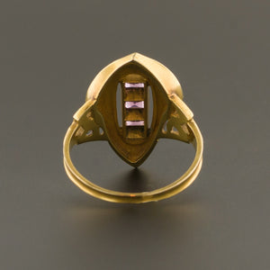 The ring is 14k gold and in great condition with minimal chipping to the facets of the garnets (visible under magnification). It is a size 5.25, but can be re-sized free of charge.