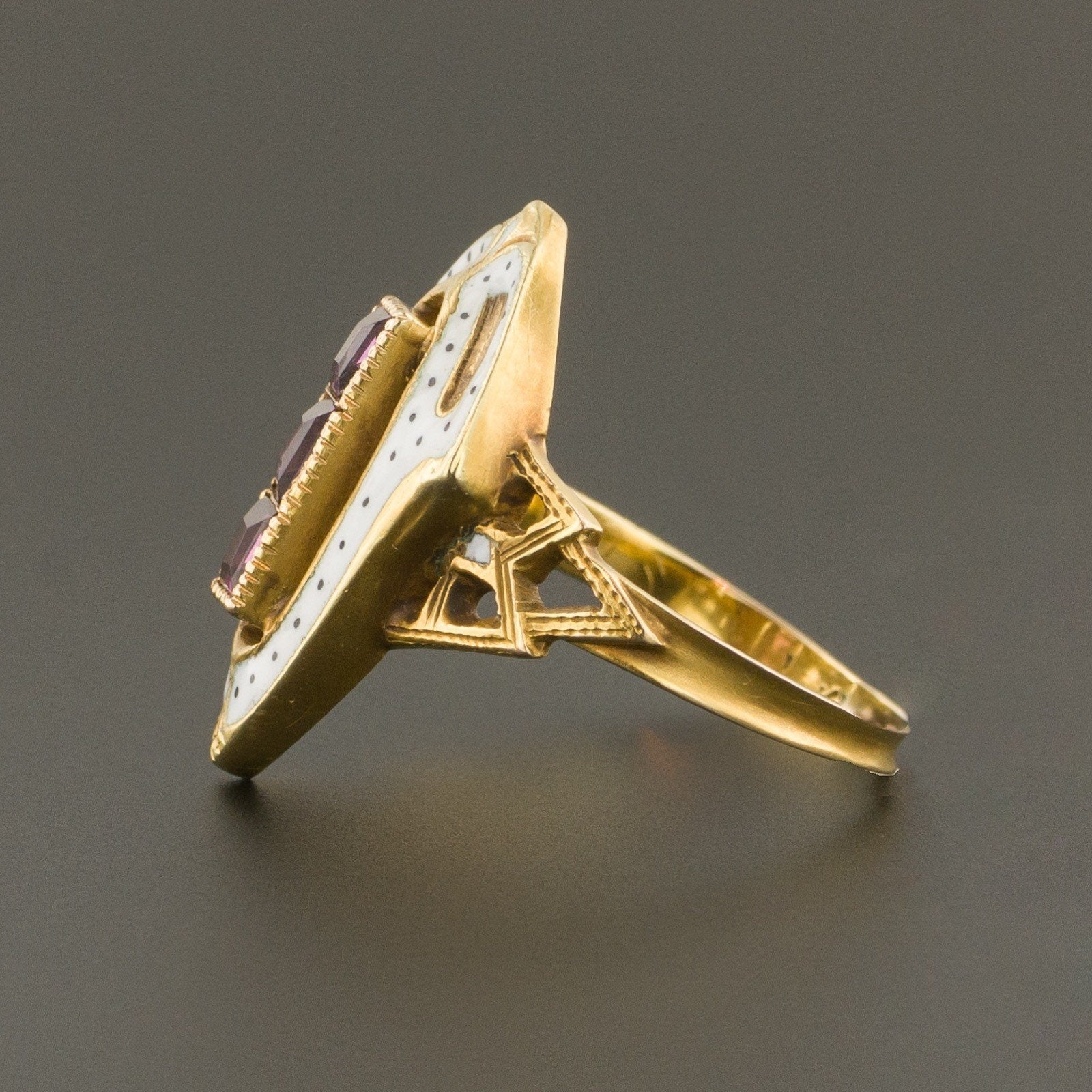 This extraordinary ring features a row of three pink hued garnets framed by crisp black and white polka dot enamel. The open shoulders of the band complement the shield design and are accented with matching white enamel.